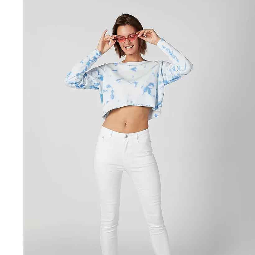 เสื้อยืดครอปมัดย้อมสำหรับผู้หญิงเสื้อยืดคอกลมแขนยาวใส่สบายแนวสตรีทฤดูร้อนผ้าถักนิตติ้งบริการ OEM