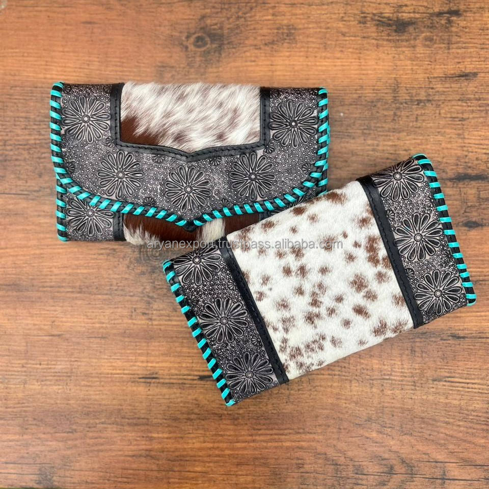 ผู้หญิงเครื่องมือหนัง Turquoise กระเป๋าสตางค์ลูกไม้ของแท้ Cowhide มือตะเข็บกระเป๋าสตางค์หนังผมตะวันตกบนซ่อนกระเป๋าสตางค์บัตรเครดิต
