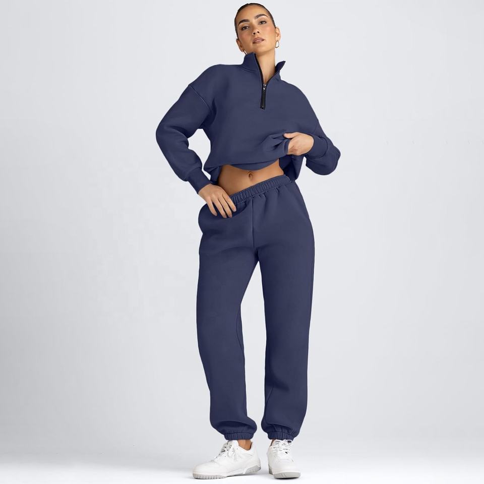 ชุดวอร์ม2ชิ้นสำหรับผู้หญิง, ผ้าฝ้าย100% กางเกงขายาวแบบสวมหัวซิปครึ่งเดียวพร้อมกระเป๋าชุดฤดูหนาวสีดำล้วน