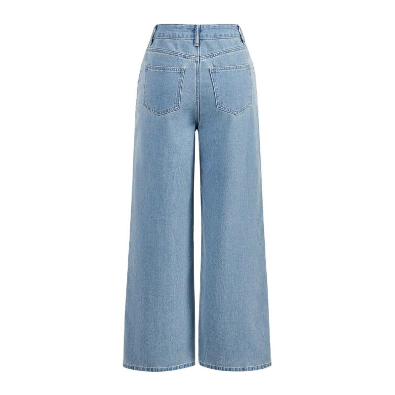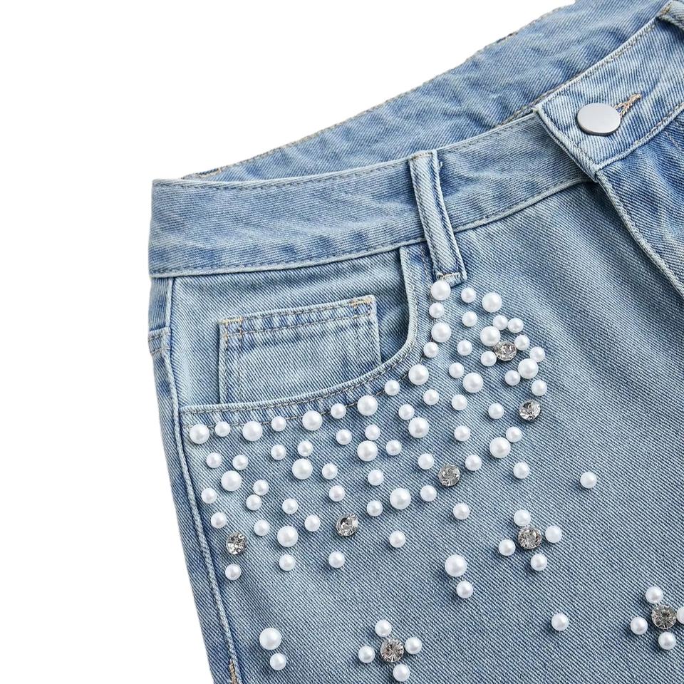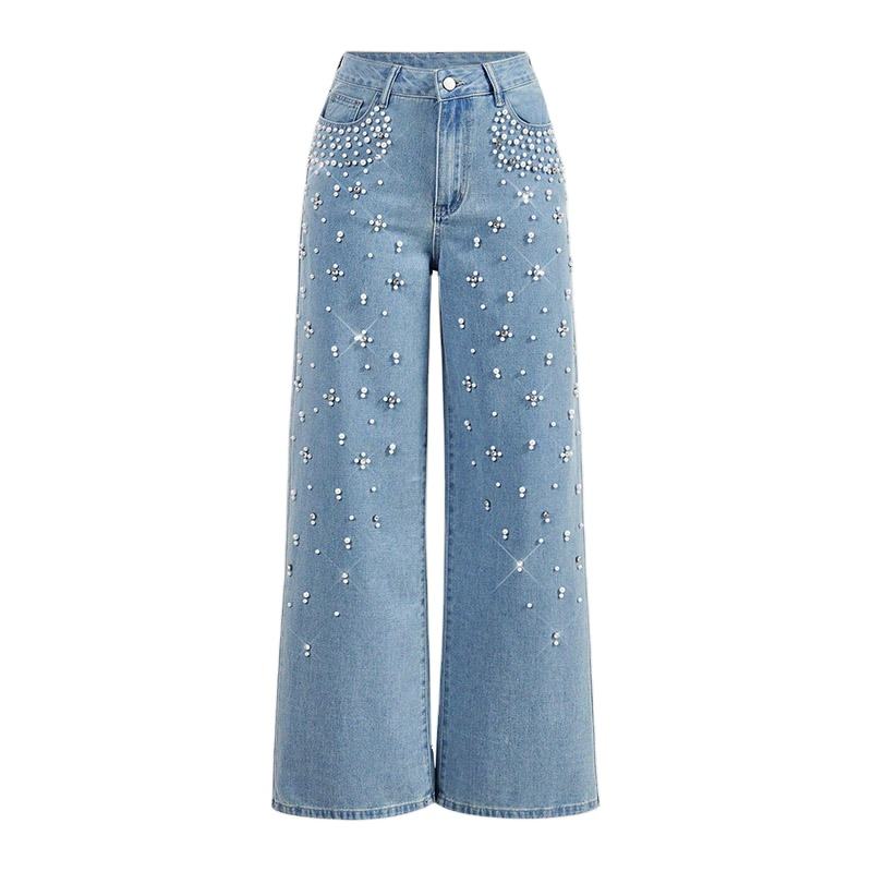 กางเกงยีนส์เดนิมสีฟ้าอ่อนทรงตรงเอวสูงประดับเพชรพลอยสไตล์วินเทจลำลองสำหรับผู้หญิง เหมาะสำหรับฤดูร้อน