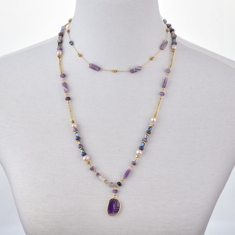 สร้อยคอจี้หินอเมทิสต์ธรรมชาติประดับมุกแฟชั่นสำหรับผู้หญิง สไตล์ลำลองสำหรับงานปาร์ตี้