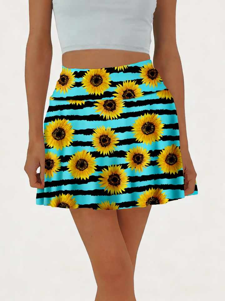 กระโปรงสั้นทรงเอไลน์ลายดอกทานตะวันสีเทอร์ควอยซ์และดำสำหรับผู้หญิง เอวสูง ทรงสเก็ตเตอร์ ลำลอง เหมาะสำหรับฤดูร้อน