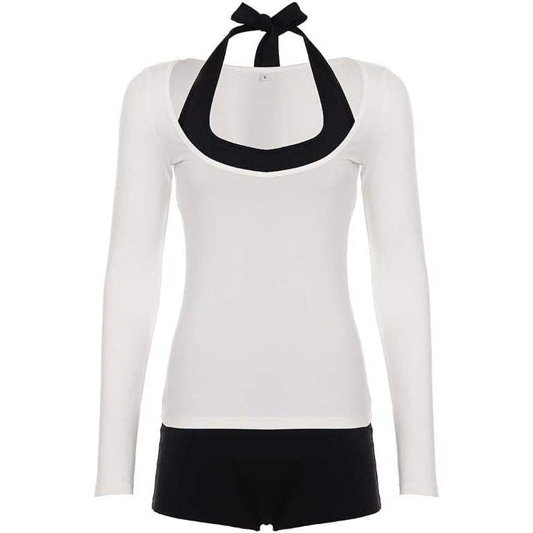 ชุดออกกำลังกายสองชิ้นสำหรับผู้หญิง เสื้อแขนยาวและกางเกงขาสั้น ชุดกีฬาเนื้อผ้ายืดหยุ่น ระบายอากาศได้ดี ผลิตจากผ้าสแปนเด็กซ์และโพลีเอสเตอร์ถัก