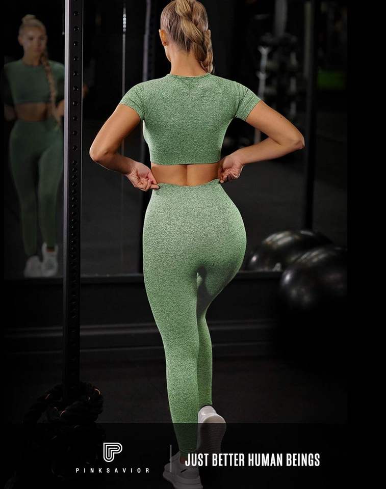 ชุดออกกำลังกายสองชิ้นของผู้หญิงเลกกิ้งเอวสูงไร้รอยต่อระบายอากาศได้เสื้อครอปท็อปชุดกีฬายิมลายพื้น