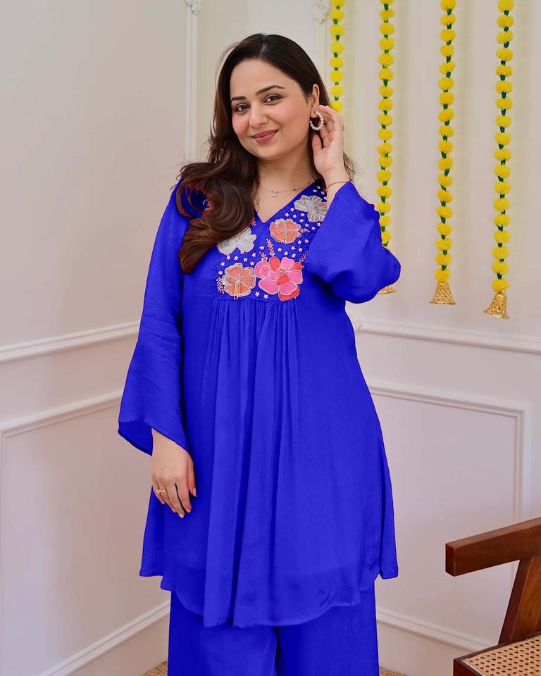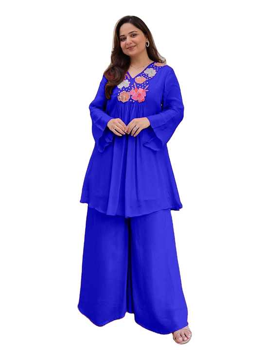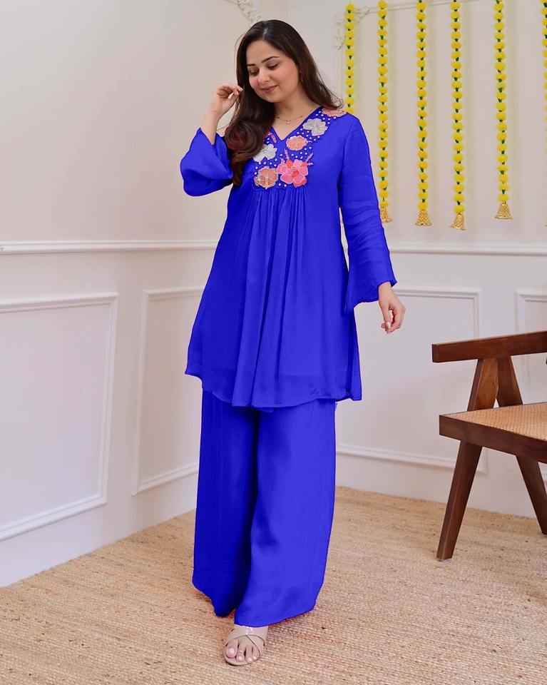 ชุดเซ็ตสองชิ้นสำหรับผู้หญิง ผ้าจอร์เจตต์แท้ ทรงขากว้าง ดีไซน์ปักลายอย่างประณีต เพื่อความสบายและสง่างาม ผลิตจากโพลีเอสเตอร์