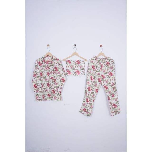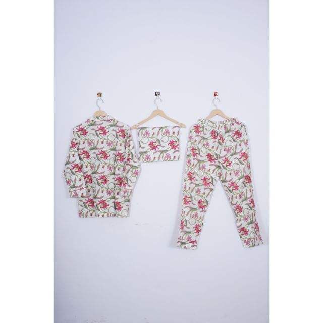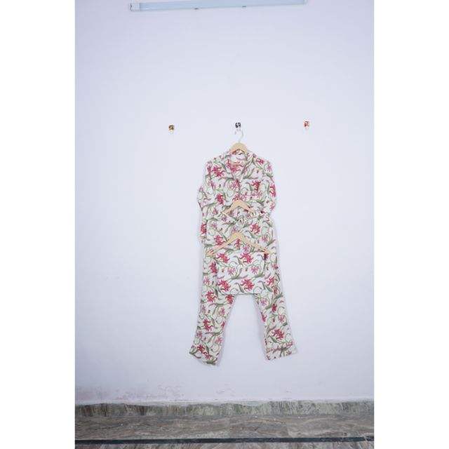 ชุดนอนสตรีผ้าคอตตอนเนื้อนุ่มพิเศษพิมพ์ลายดอกไม้ชุดเสื้อและกางเกงสำหรับใส่ตอนกลางคืนไซส์ XL