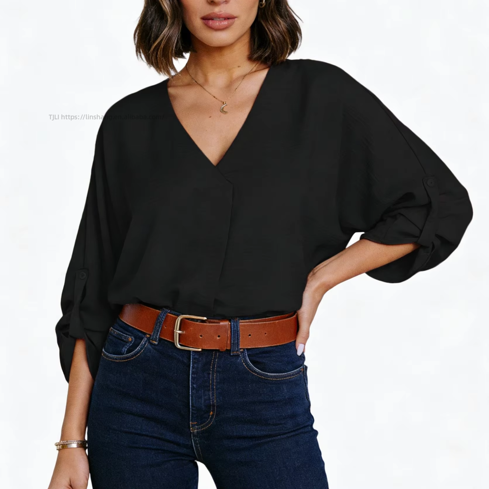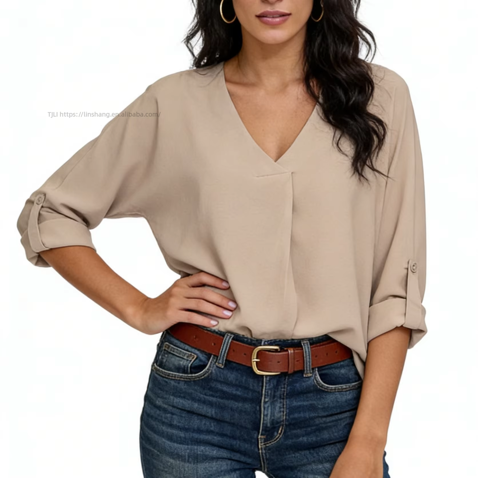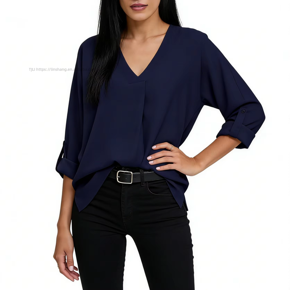 เสื้อเชิ้ตผู้หญิงคอวีทรงโอเวอร์ไซส์แขนยาวหลวมๆ ผ้าชีฟอง สไตล์ลำลอง แฟชั่น