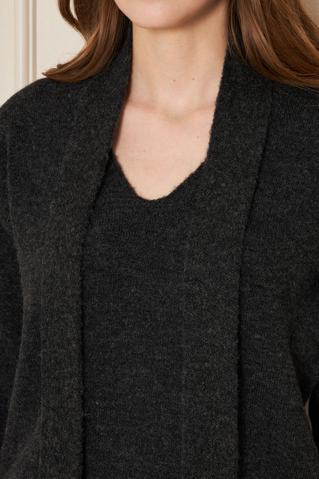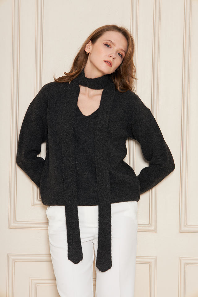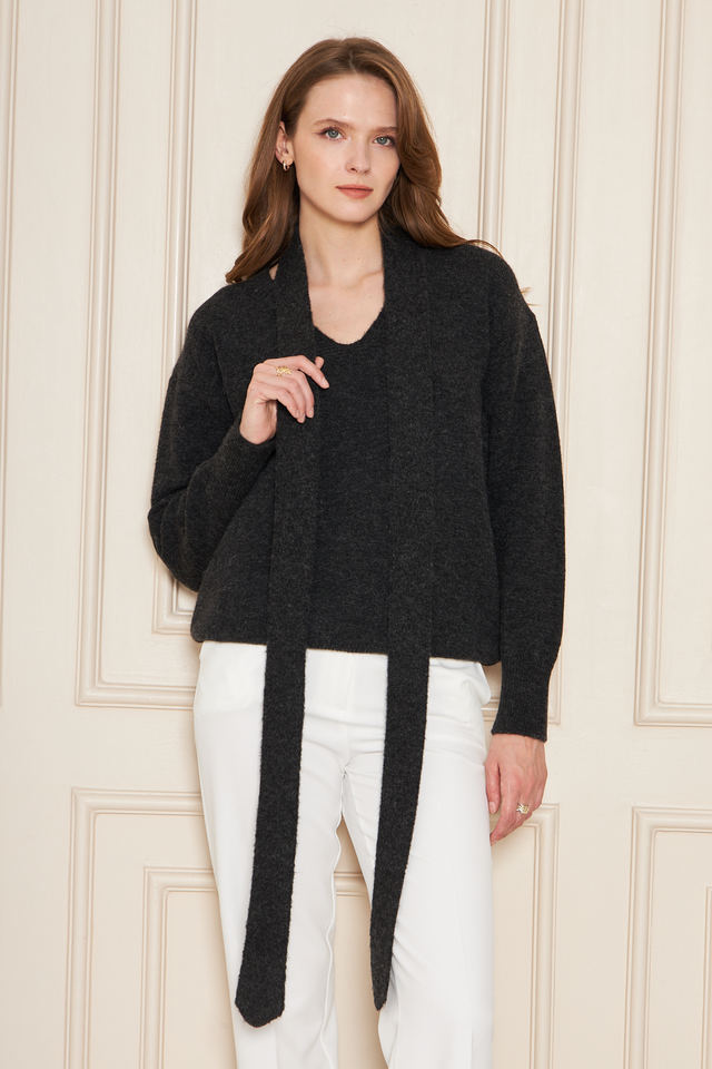 ชุดเสื้อสเวตเตอร์ถักคอวีทรงโอเวอร์ไซส์และผ้าพันคอสำหรับผู้หญิง – ชุดฤดูหนาวสองชิ้นแบบหลวมๆ ผสมผสานขนสัตว์ที่ดูหรูหราและสบายๆ