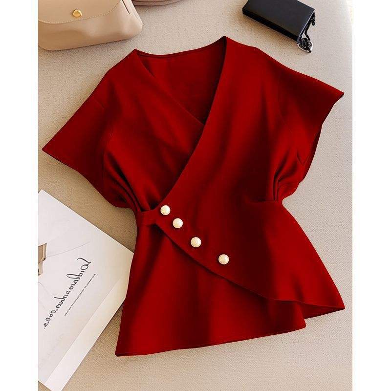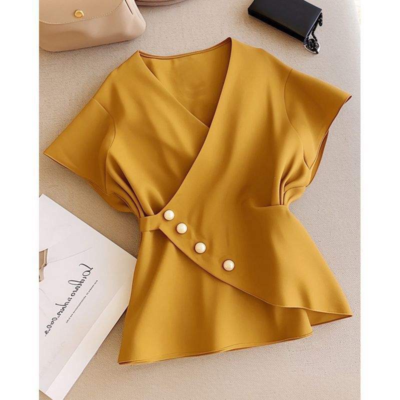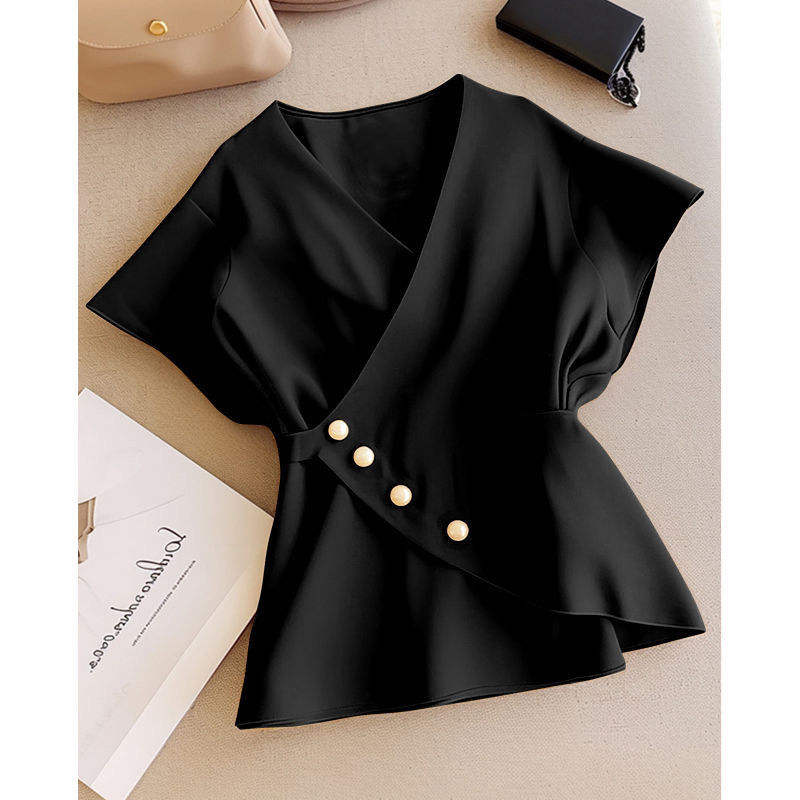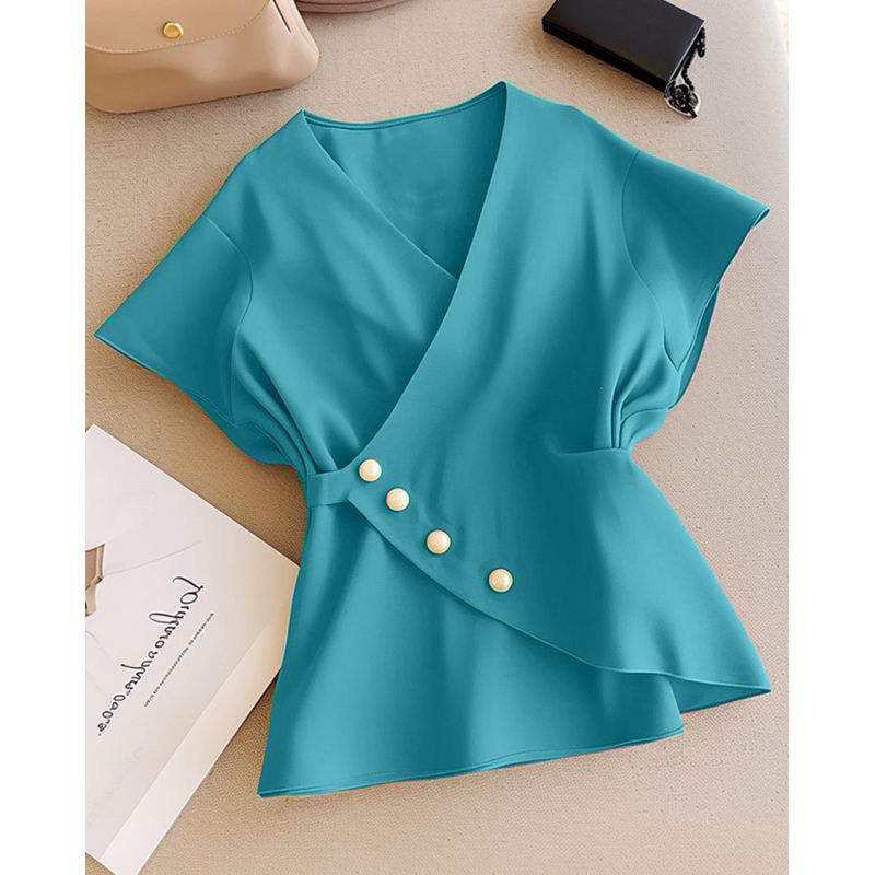 เสื้อเบลาส์คอวีติดกระดุมมุกสำหรับผู้หญิง - เสื้อเชิ้ตแฟชั่นแขนสั้นระบายชายเสื้อสไตล์ลำลองสำหรับใส่ทำงาน