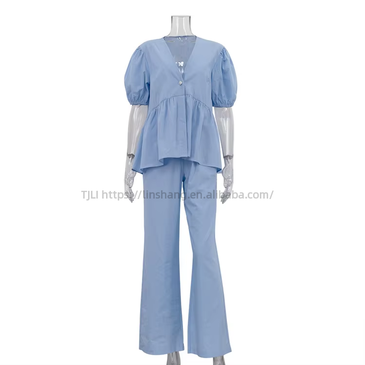 เสื้อคาร์ดิแกนแขนพองคอวีของผู้หญิงและกางเกงขากว้างชุดแฟชั่น 2 ชิ้น