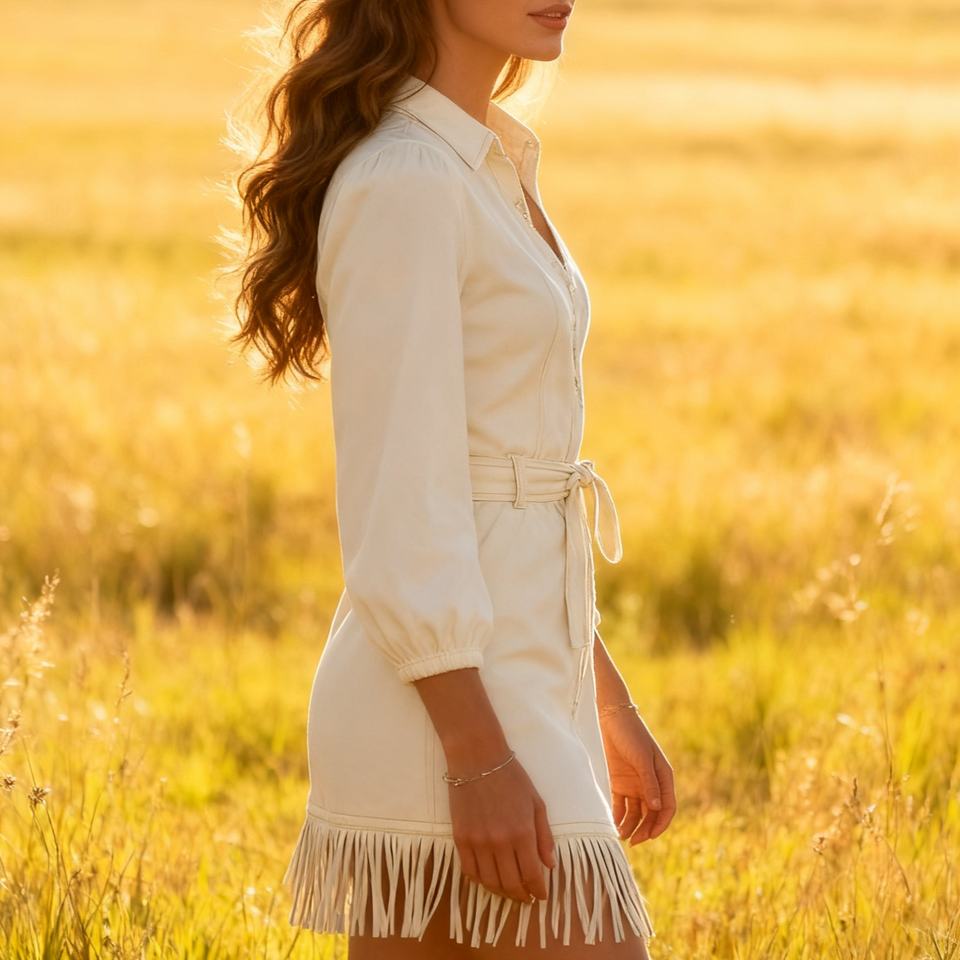 เดรสแฟชั่นผ้าเดนิมเทียมทรงวีคอ แขนพอง แต่งชายระบาย พร้อมเข็มขัดสำหรับผู้หญิง