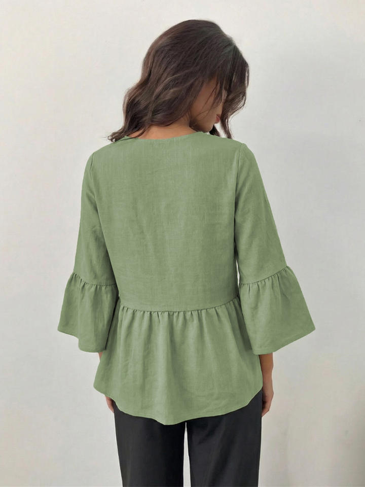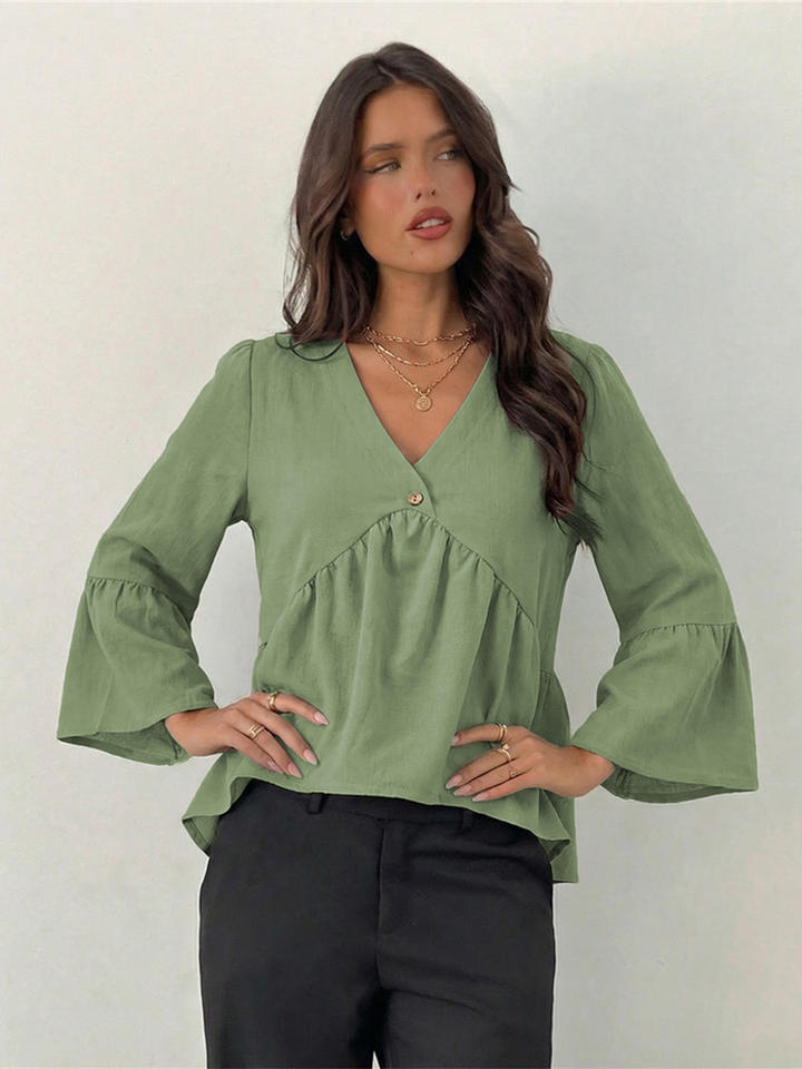 เสื้อเชิ้ตผู้หญิงคอวีสีขาวแขนเก้าส่วนน้ำหนักเบาระบายอากาศได้ดีเสื้อเชิ้ตสำนักงานฤดูร้อนเสื้อเชิ้ตลำลองหลวมๆโพลีเอสเตอร์แขนบาน