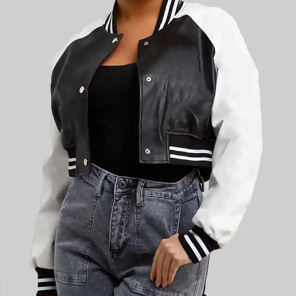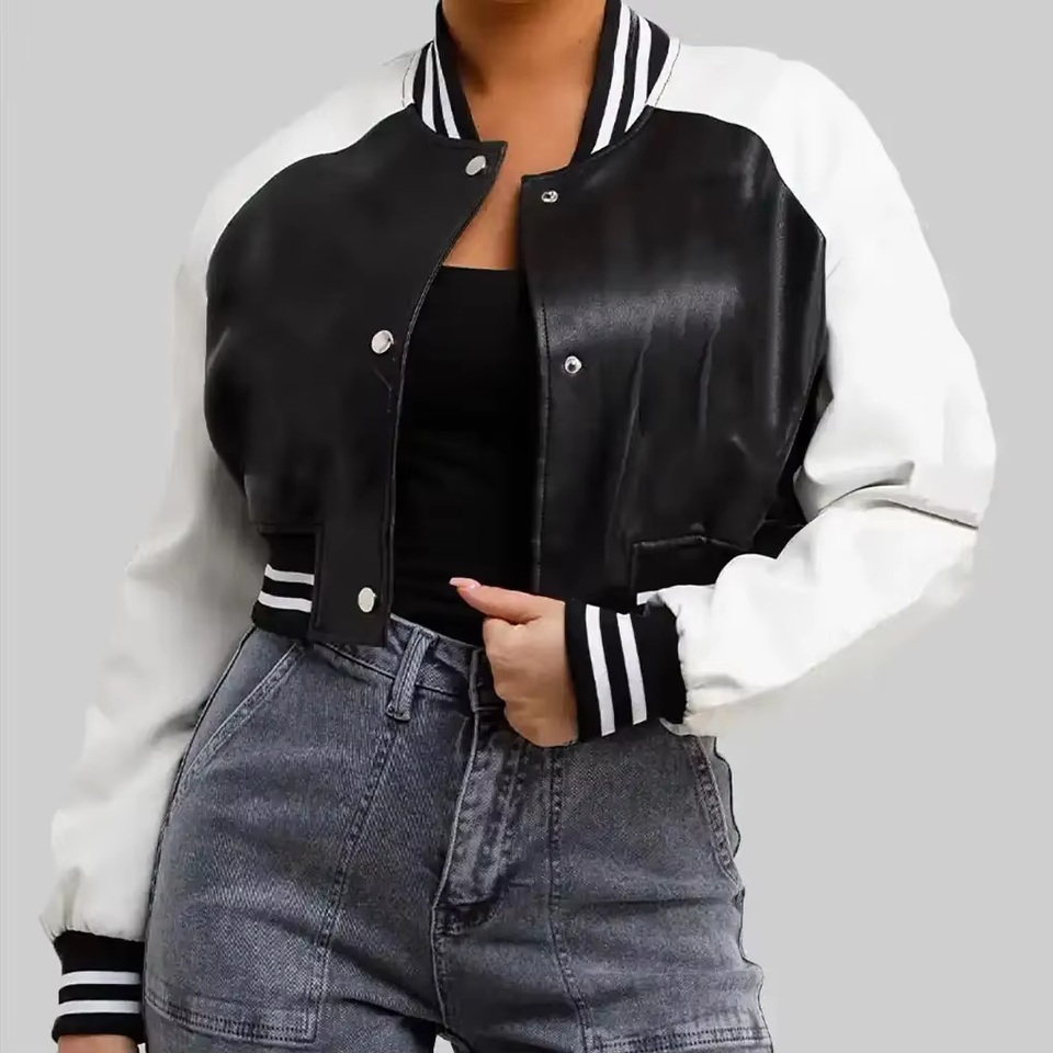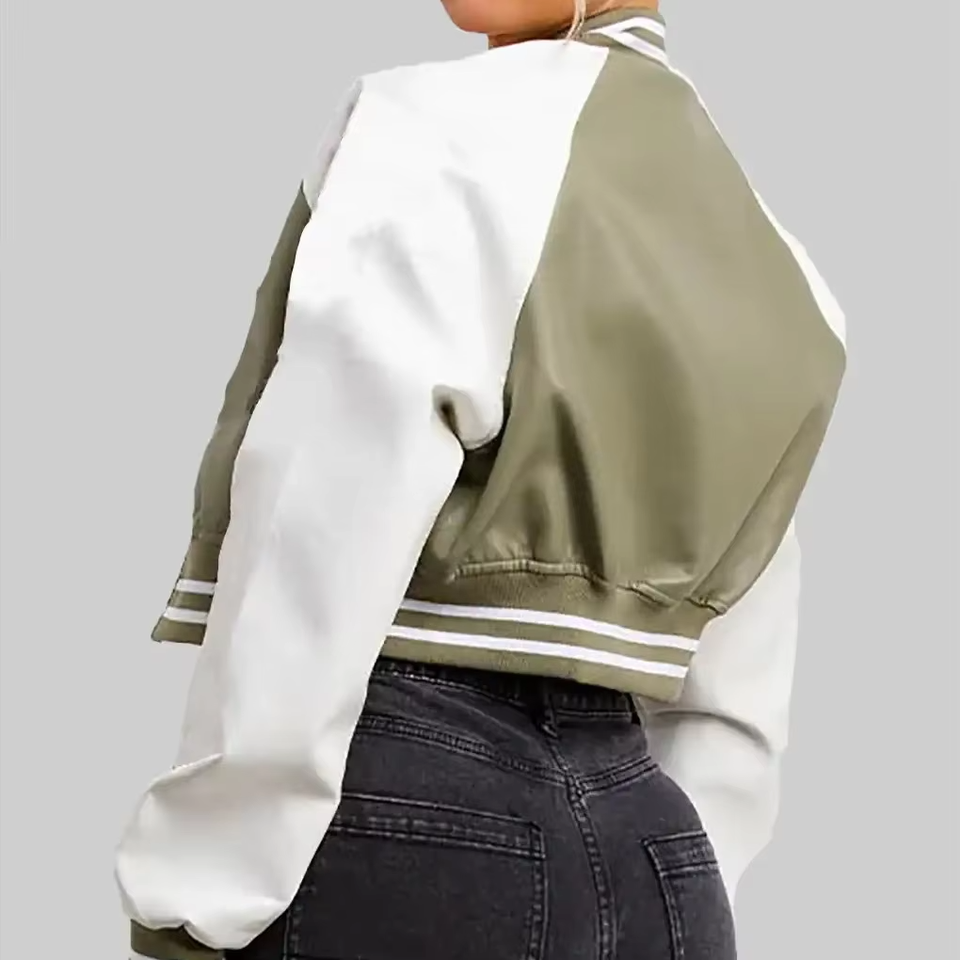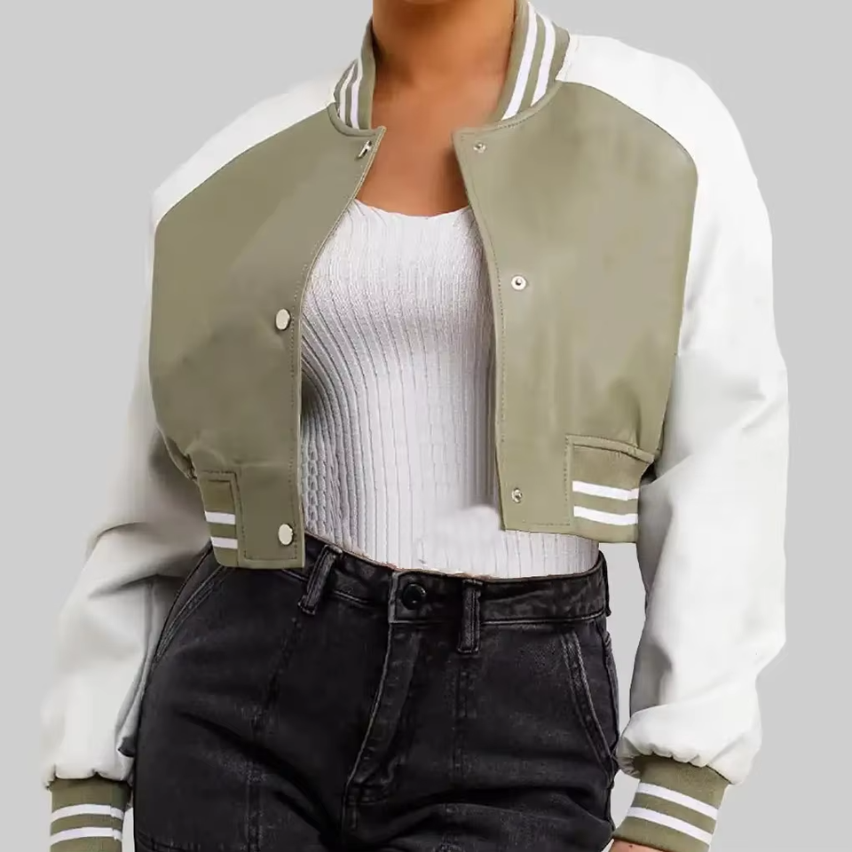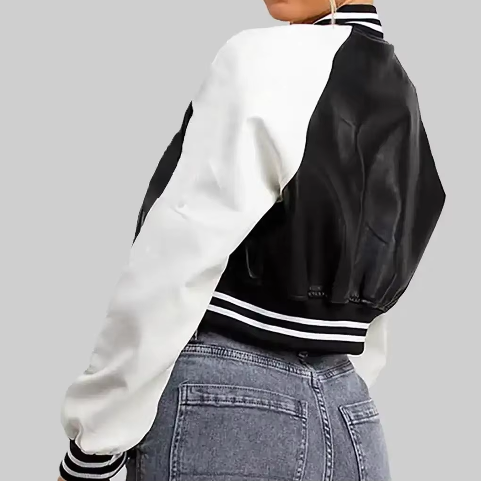 เสื้อแจ็คเก็ตเบสบอลวาร์ซิตี้สำหรับผู้หญิง คุณภาพพรีเมียม แบบครอป ปักโลโก้ตามสั่ง ขายส่งเสื้อแจ็คเก็ตวาร์ซิตี้สำหรับผู้หญิง