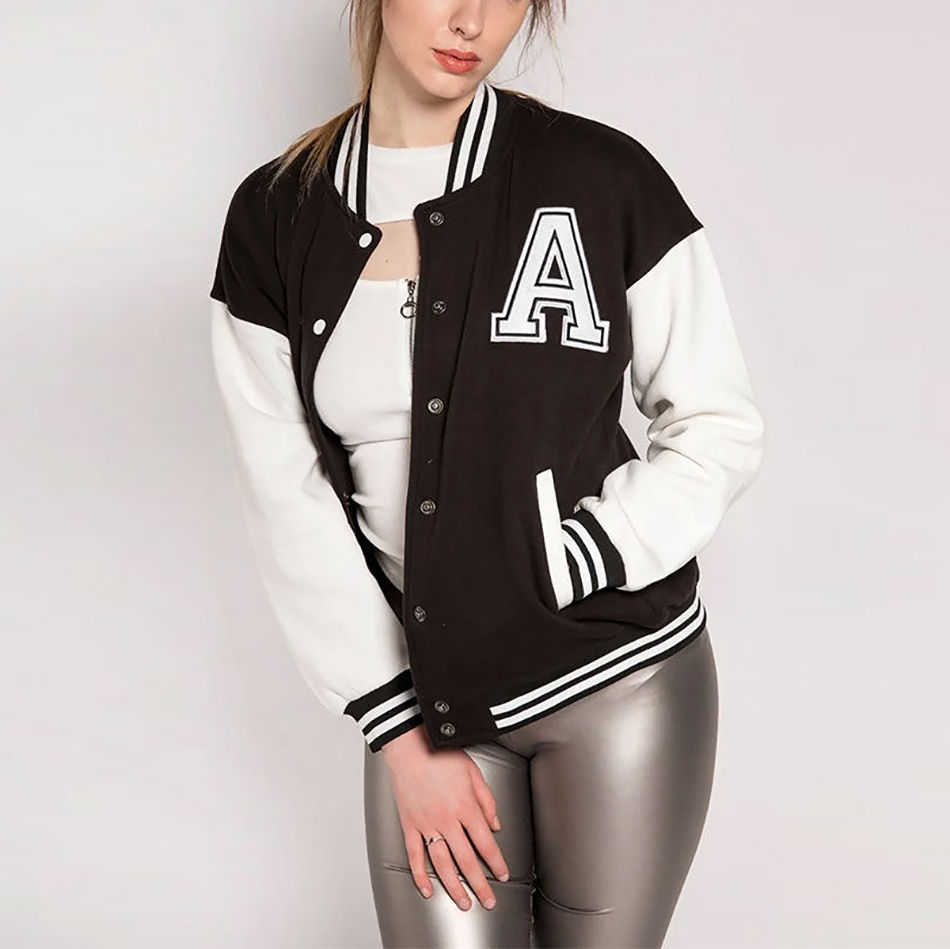 แจ็กเก็ตเลตเตอร์แมนสำหรับผู้หญิงแจ็กเก็ตหนังคุณภาพสูงเปิดไหล่ราคาขายส่ง
