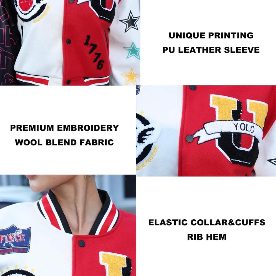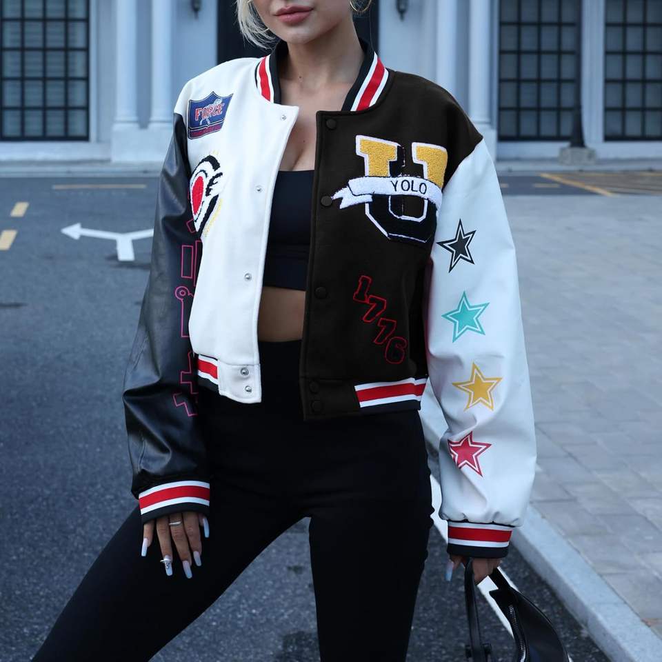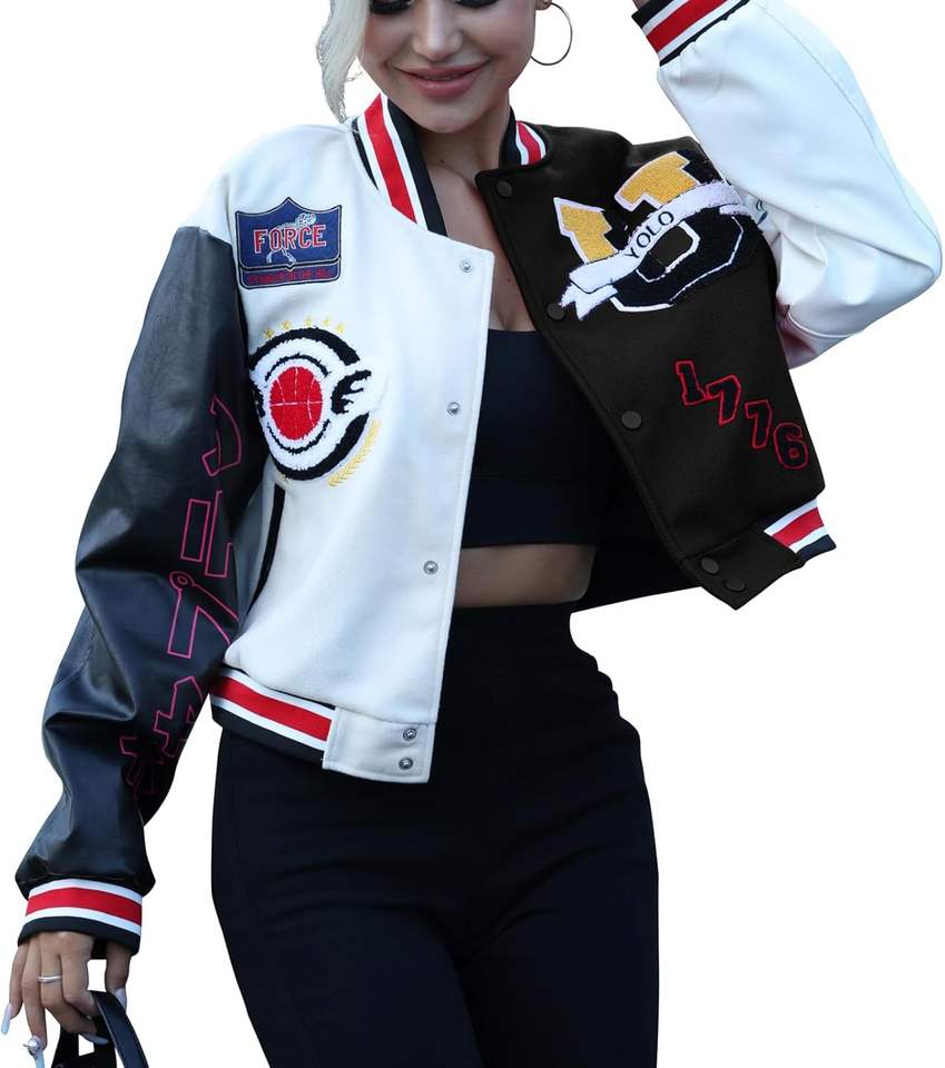 Women's Varsity Style Cropped Casual Jacket Breathable Satin Baseball Bomber Colorblock Outerwear Vintage Streetwear Patch Y2K
