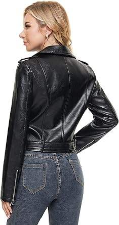 เสื้อแจ็คเก็ตหนังวีแกนสำหรับผู้หญิง แบบมีซิป ระบายอากาศได้ดี สไตล์นักขี่มอเตอร์ไซค์ สำหรับฤดูหนาว ลายเรียบ ดูเหมือนหนังแกะ ผลิตจากโพลีเอสเตอร์ ด้านหน้า