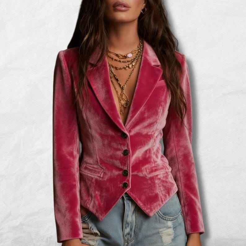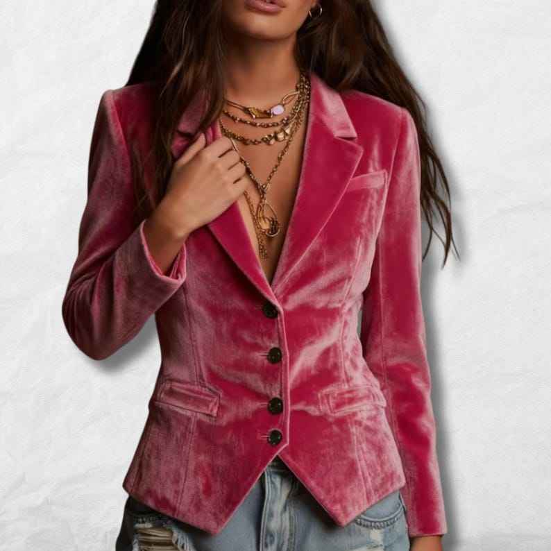 เสื้อโค้ทกำมะหยี่ผู้หญิงสไตล์เรโทร สีชมพูอ่อน – เบลเซอร์กำมะหยี่