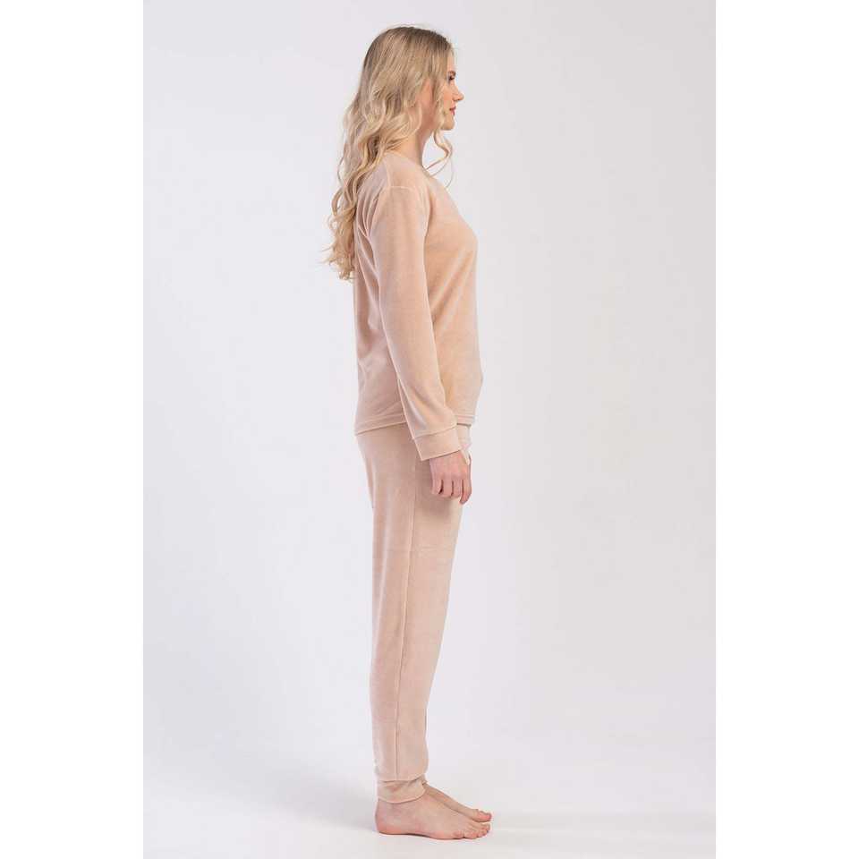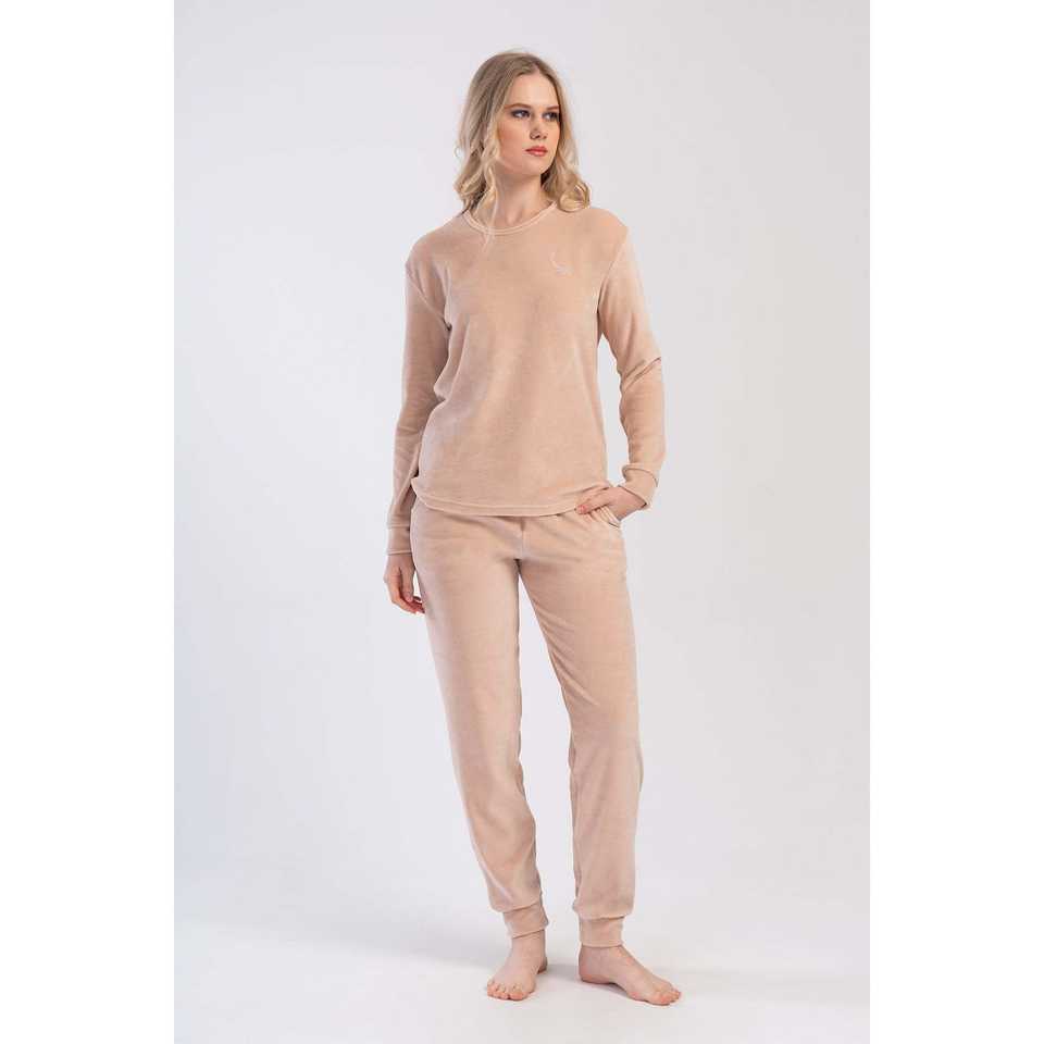 ชุดนอนกำมะหยี่คอกลมแขนยาวสำหรับผู้หญิงพร้อมกระเป๋าแบบมีจีบ