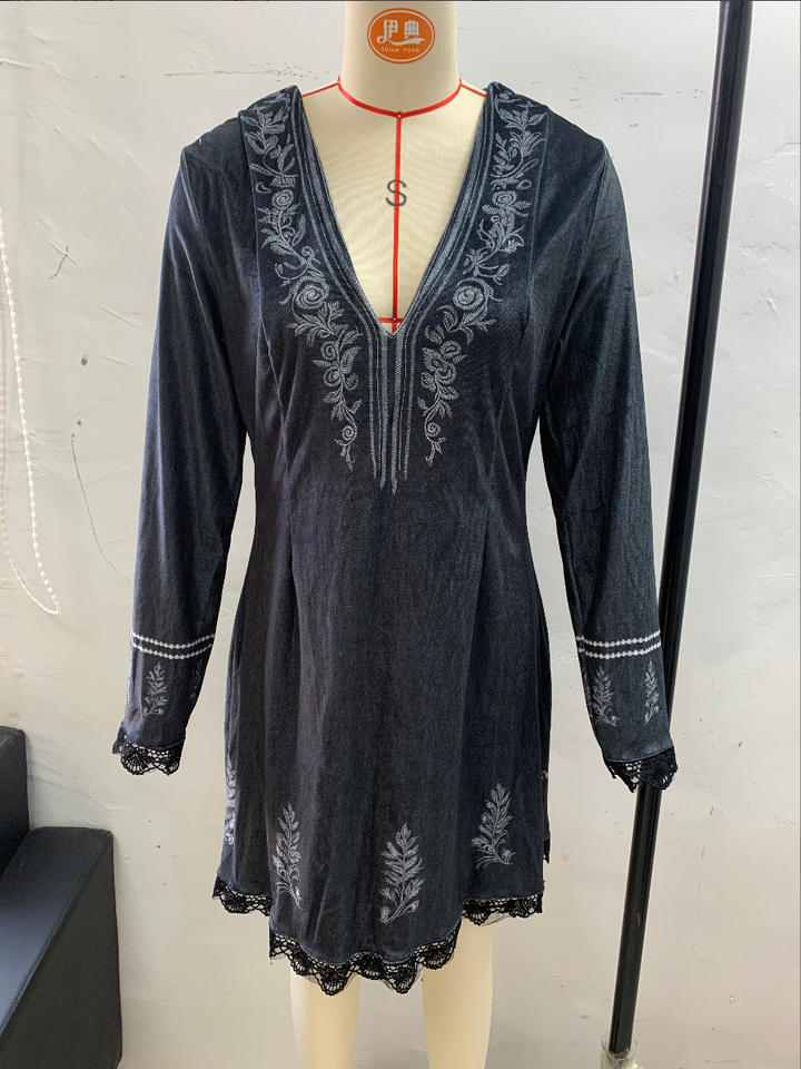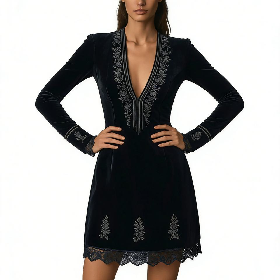 ชุดเดรสสั้นผ้ากำมะหยี่ปักลายสำหรับผู้หญิง คอวีลึก แขนยาว แต่งลูกไม้ สไตล์วินเทจ หรูหรา สำหรับงานเลี้ยงตอนเย็น แฟชั่น