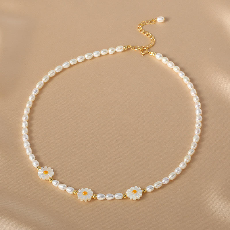 สร้อยคอมุกน้ำจืดธรรมชาติเรียบง่ายอเนกประสงค์สำหรับผู้หญิง ดีไซน์โซ่คล้องไหปลาร้ารูปดอกเดซี่ระดับไฮเอนด์