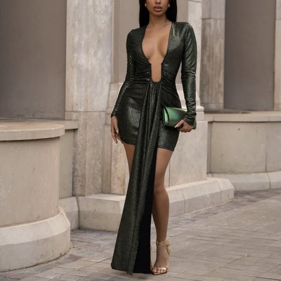 ชุดเดรสสั้นสีเขียววิบวับสำหรับผู้หญิง ชุดราตรีหรูหรา ประดับเลื่อมวิบวับ เซ็กซี่ คอวี