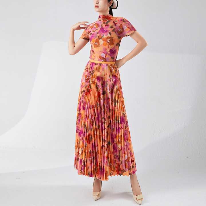 ชุดเซ็ตแขนสั้นพิมพ์ลายสไตล์วินเทจลายดอกไม้ ผ้าพลีท คอเต่า ไม่เป็นขุย ใส่สบาย เป็นมิตรกับสิ่งแวดล้อม สำหรับผู้หญิง ฤดูร้อน สามารถปรับแต่งลายได้