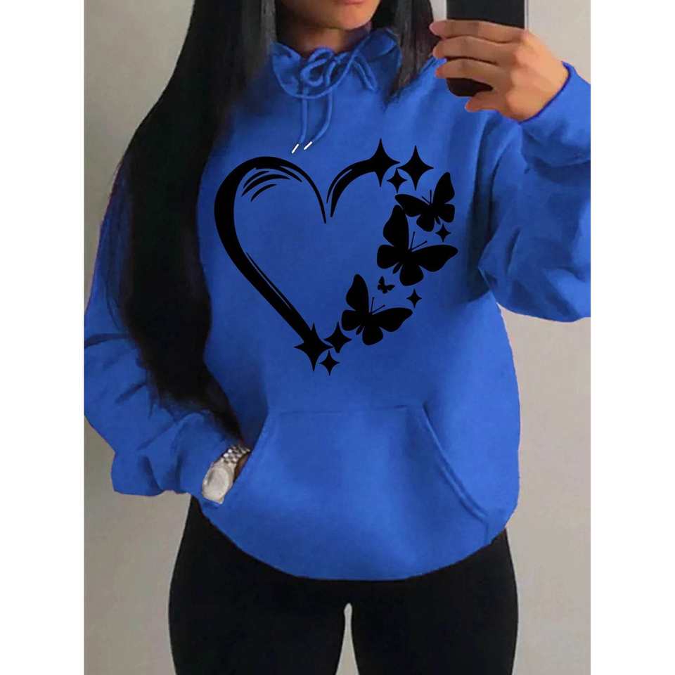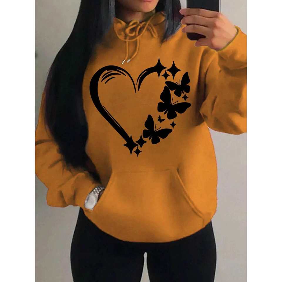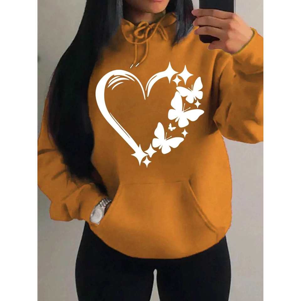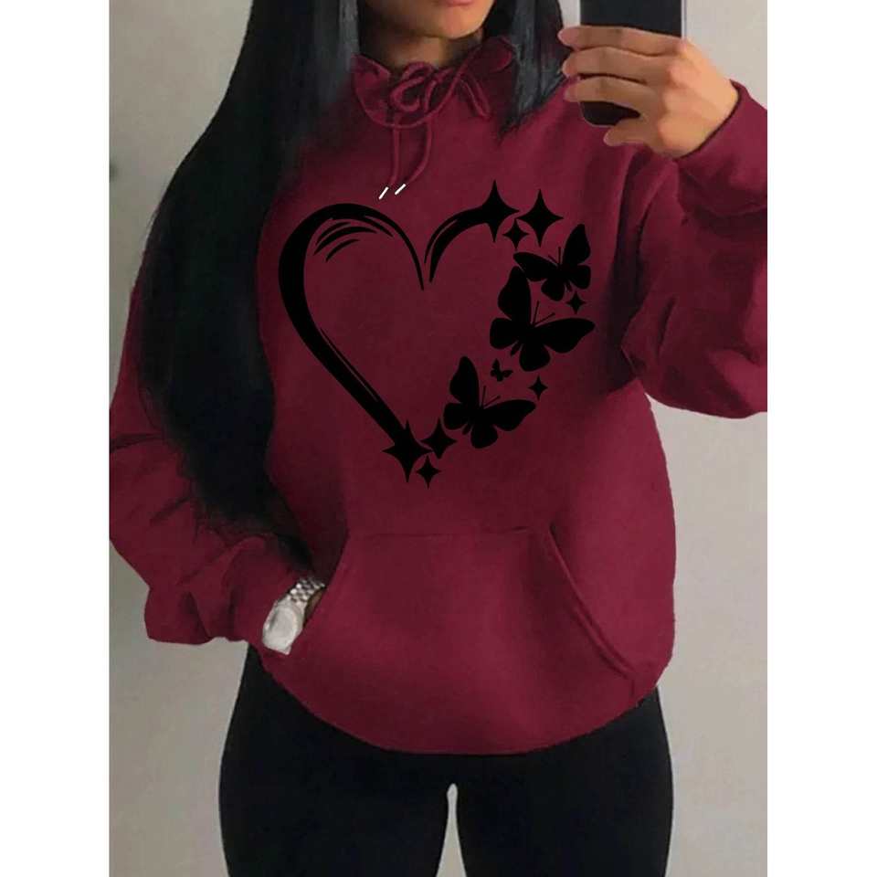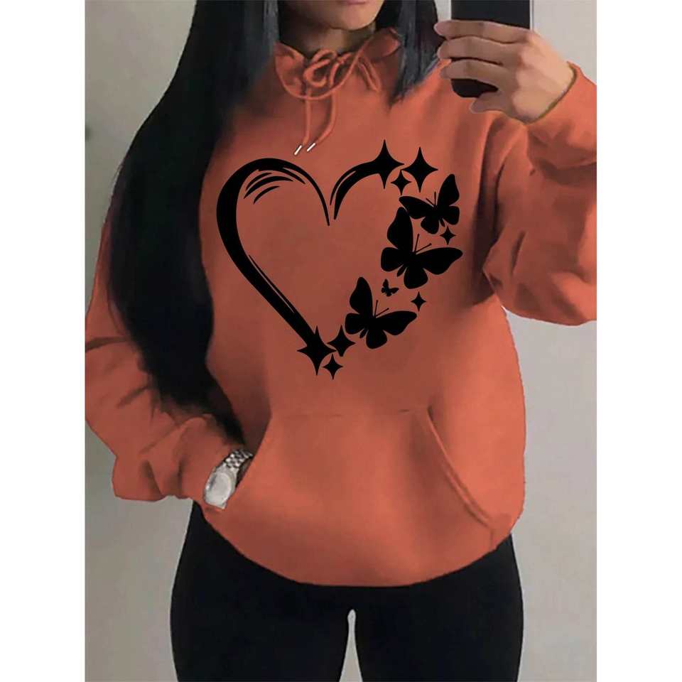 Women's Vintage Multicolour 3D Love Butterfly Hoodie Street Style O-Neck Fleece Full Sleeve Trendy Pocket Hip Hop Fashion
