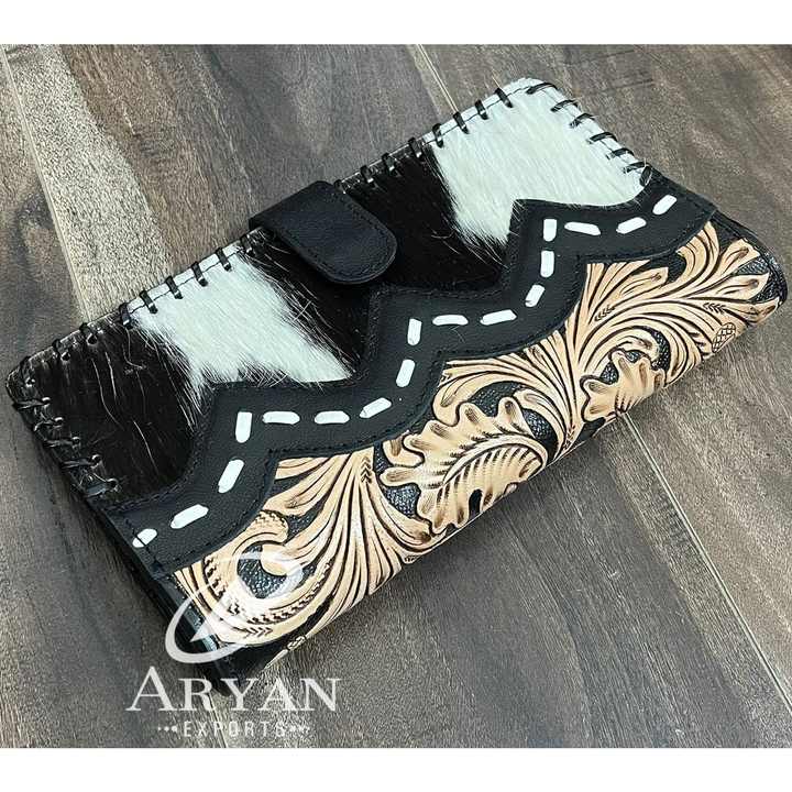 กระเป๋าสตางค์หนังวัวแท้สไตล์วินเทจแบบตะวันตกสำหรับผู้หญิง พร้อมลายดอกไม้สลักมือ ดีไซน์เนอร์ทำมือ