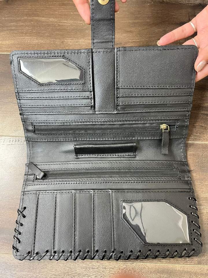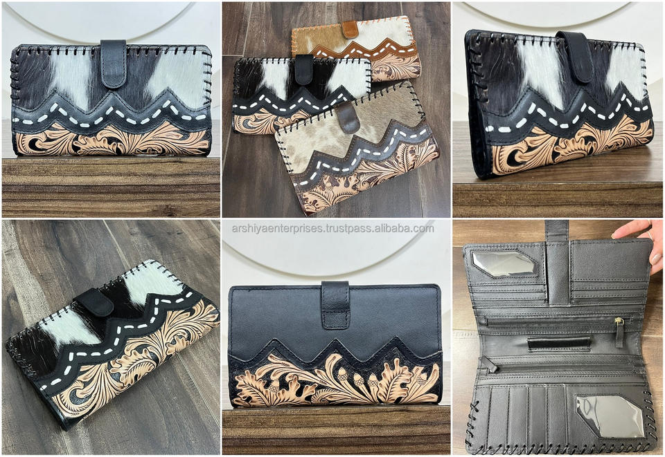 กระเป๋าสตางค์หนังวัวแท้สไตล์วินเทจแบบตะวันตกสำหรับผู้หญิง พร้อมลายดอกไม้สลักมือ ดีไซน์เนอร์ทำมือ