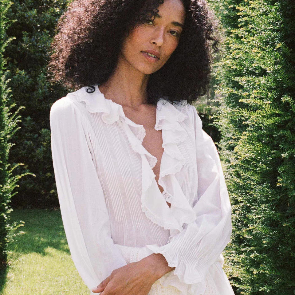 เสื้อผู้หญิงสไตล์วินเทจ ผ้าลูกไม้ แต่งจีบออร์แกน แนวฝรั่งเศส โรแมนติก ผ้าคอตตอนเนื้อหนา จีบแบบ Tuck Pleated คอวี