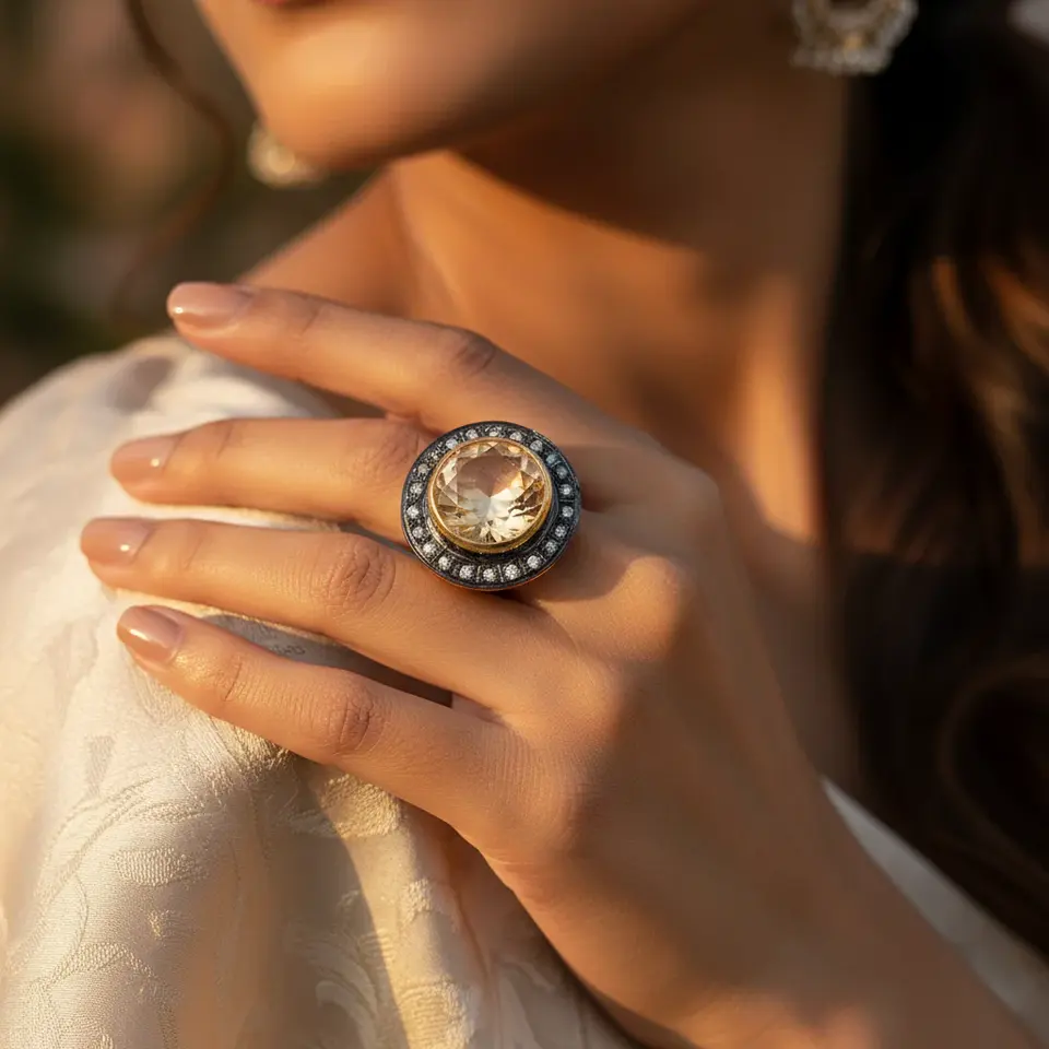 แหวนสไตล์วินเทจสำหรับผู้หญิง ประดับด้วยซิทรินและเพชร ชุบทอง 18K บนสแตนเลสสตีล