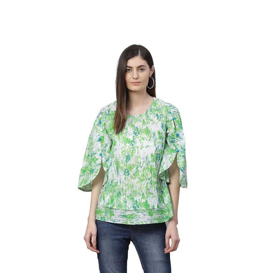 เสื้อคอตตอนมัดย้อมวินเทจของผู้หญิงเสื้อครอปสีเขียวรัดรูประบายอากาศได้แขนสามส่วนแฟชั่นทันสมัยสำหรับการออกนอกบ้านแบบลำลอง