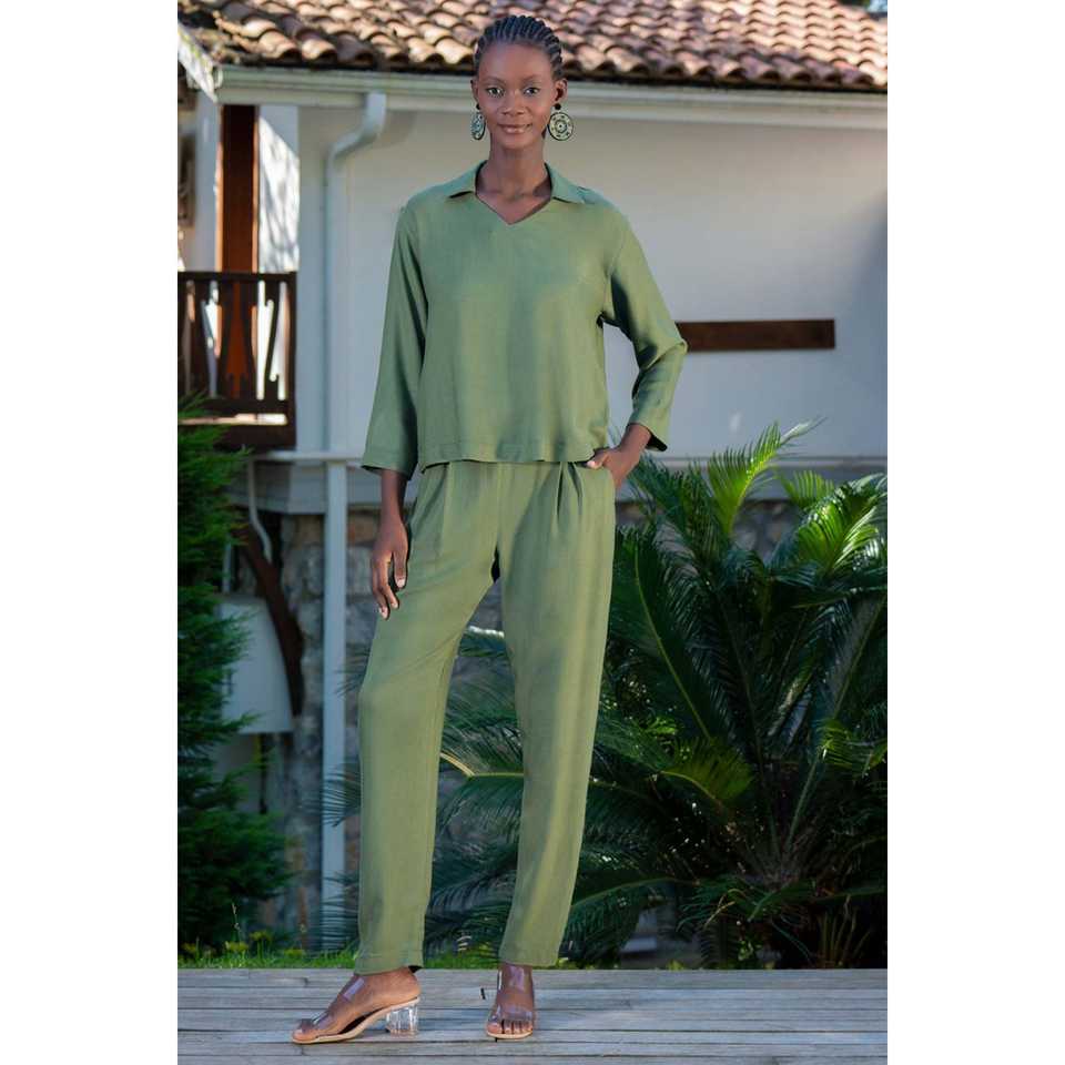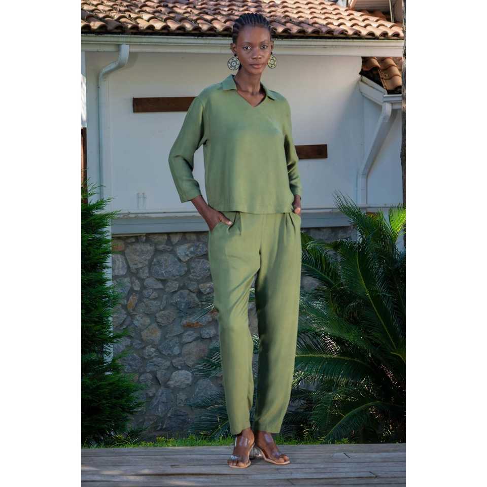 ชุดเสื้อคอวีผ้าวิสโคสสำหรับผู้หญิงและกางเกงจีบมีกระเป๋า พร้อมแขนเสื้อสามส่วนแบบไหล่ตก