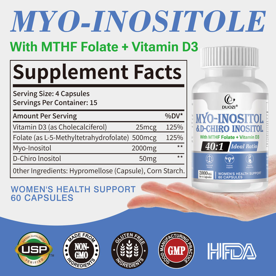 วิตามินรวมสำหรับผู้หญิง ผสมไมโอและดี-ไคโรอิโนซิทอล เอ็มทีเอชเอฟ โฟเลต และวิตามินดี3 เพื่อสมดุลฮอร์โมนและบำรุงรังไข่ 60 แคปซูล
