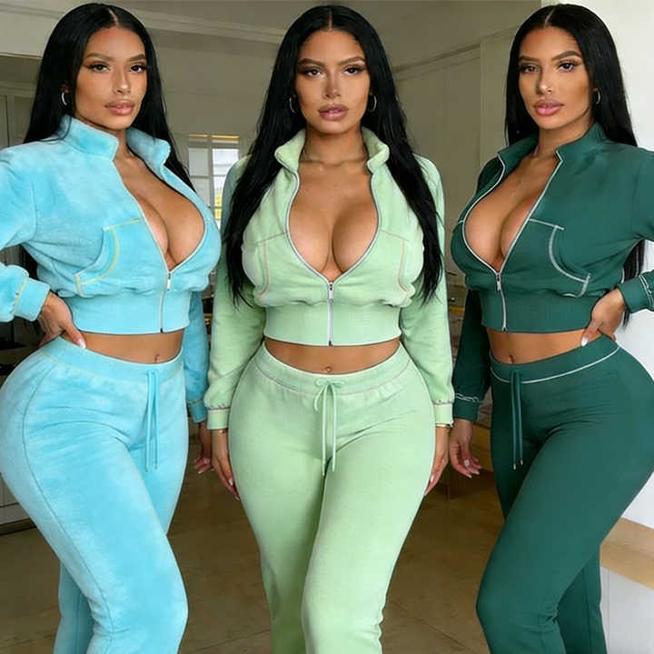 ชุดเซ็ทลำลองสำหรับผู้หญิง ผ้าถักลายวาฟเฟิลปักลาย แบบสองชิ้น เสื้อฮู้ดซิป กางเกงขาบาน ชุดออกกำลังกายเนื้อผ้านุ่มยืดหยุ่น รับสั่งทำตามแบบ