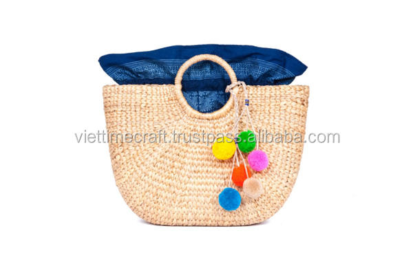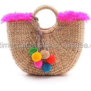 กระเป๋าถือสตรีถักมือผักตบชวาพร้อมปอมปอมกระเป๋าถือหรูหราสำหรับใช้ในชีวิตประจำวัน