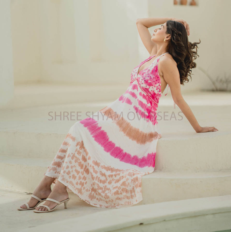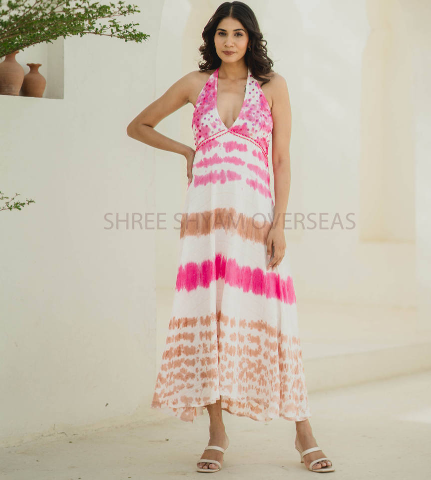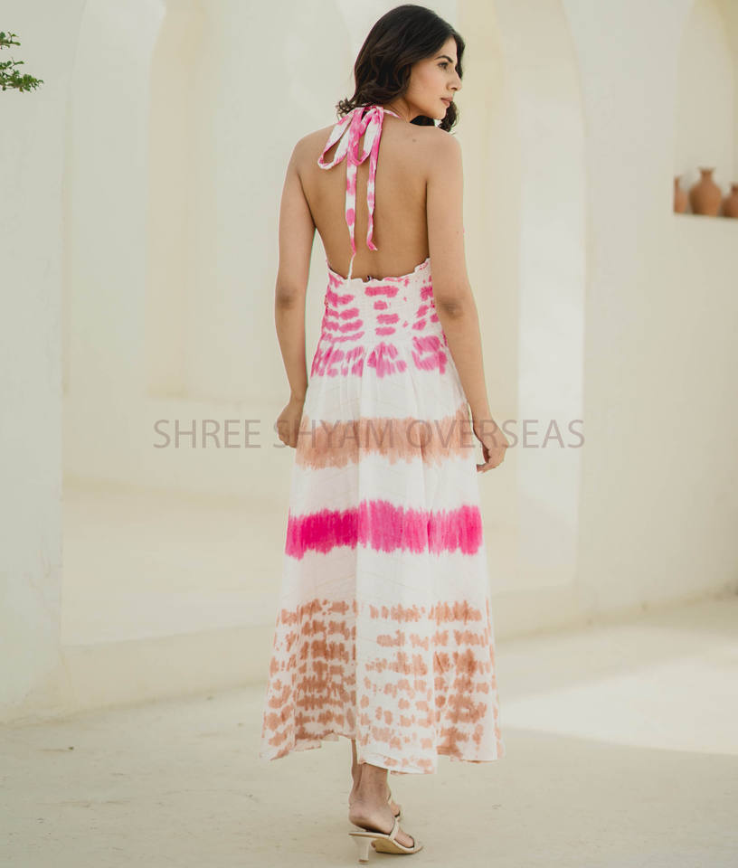 ชุดเดรสแขนกุดสำหรับผู้หญิงชุดเดรสแขนกุดเปิดหลังยาวคอเสื้อชายหาดย้อมสีแฟนซี