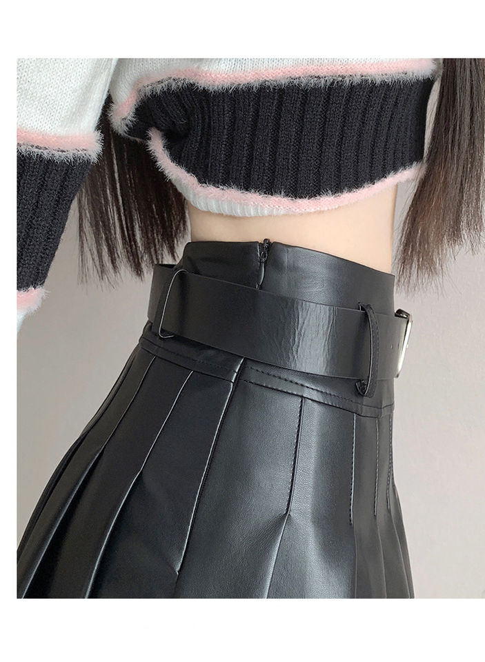 กระโปรงรัดรูปหนัง PU สำหรับผู้หญิง, กระโปรงทรงดินสอเอวสูงกระโปรงเทนนิสมินิอัดจีบสตรีทแวร์ถักแบบธรรมดา XS ธรรมชาติ