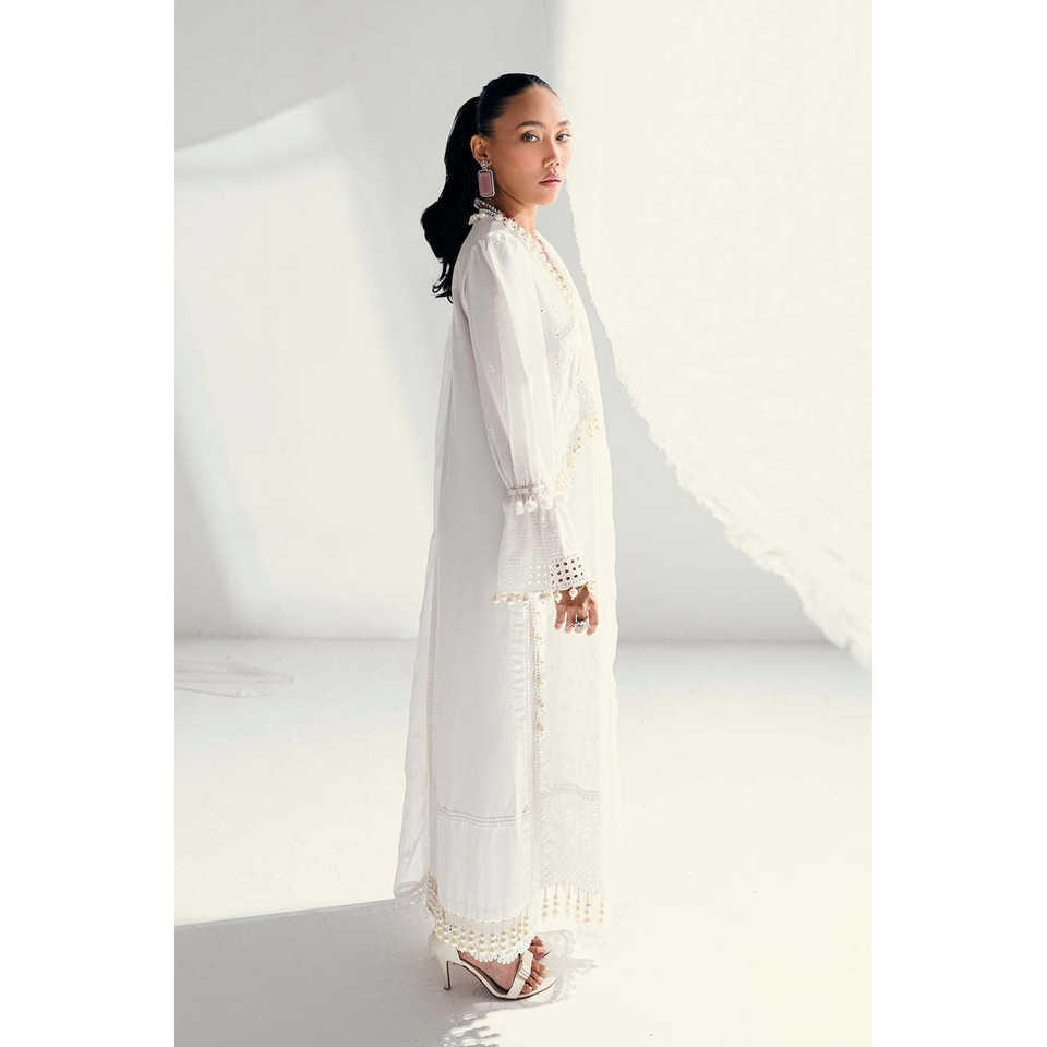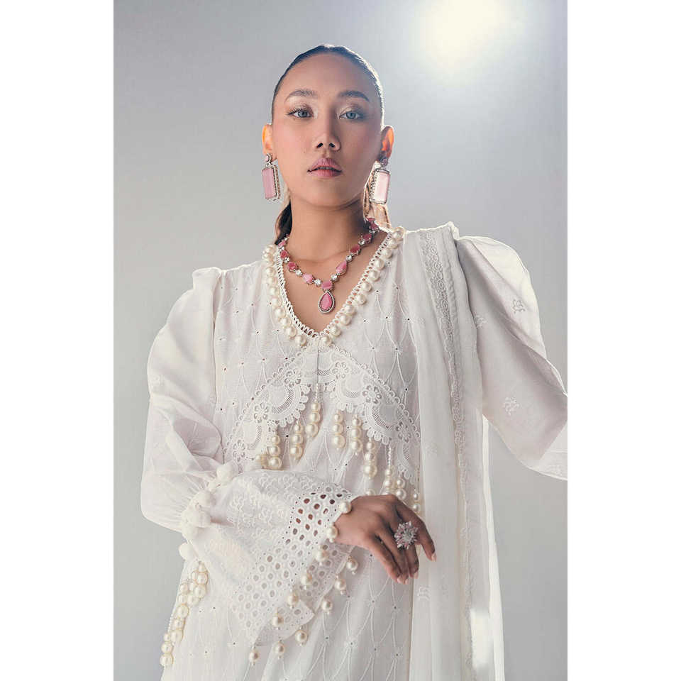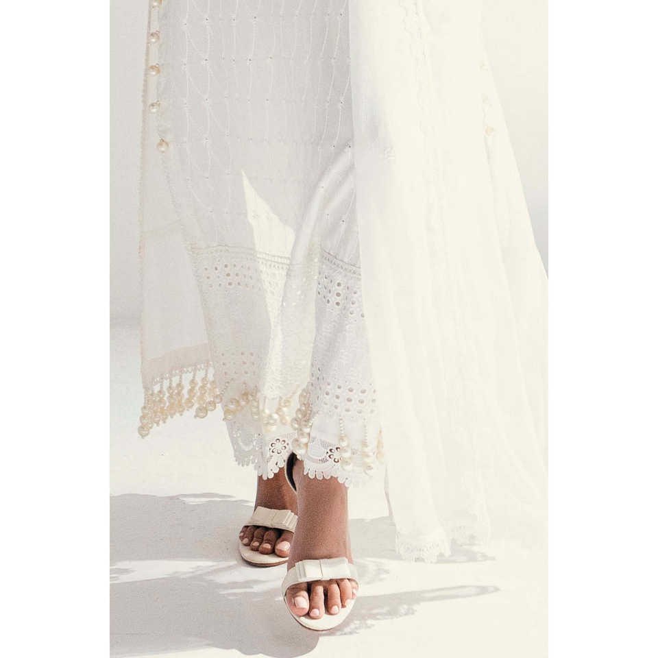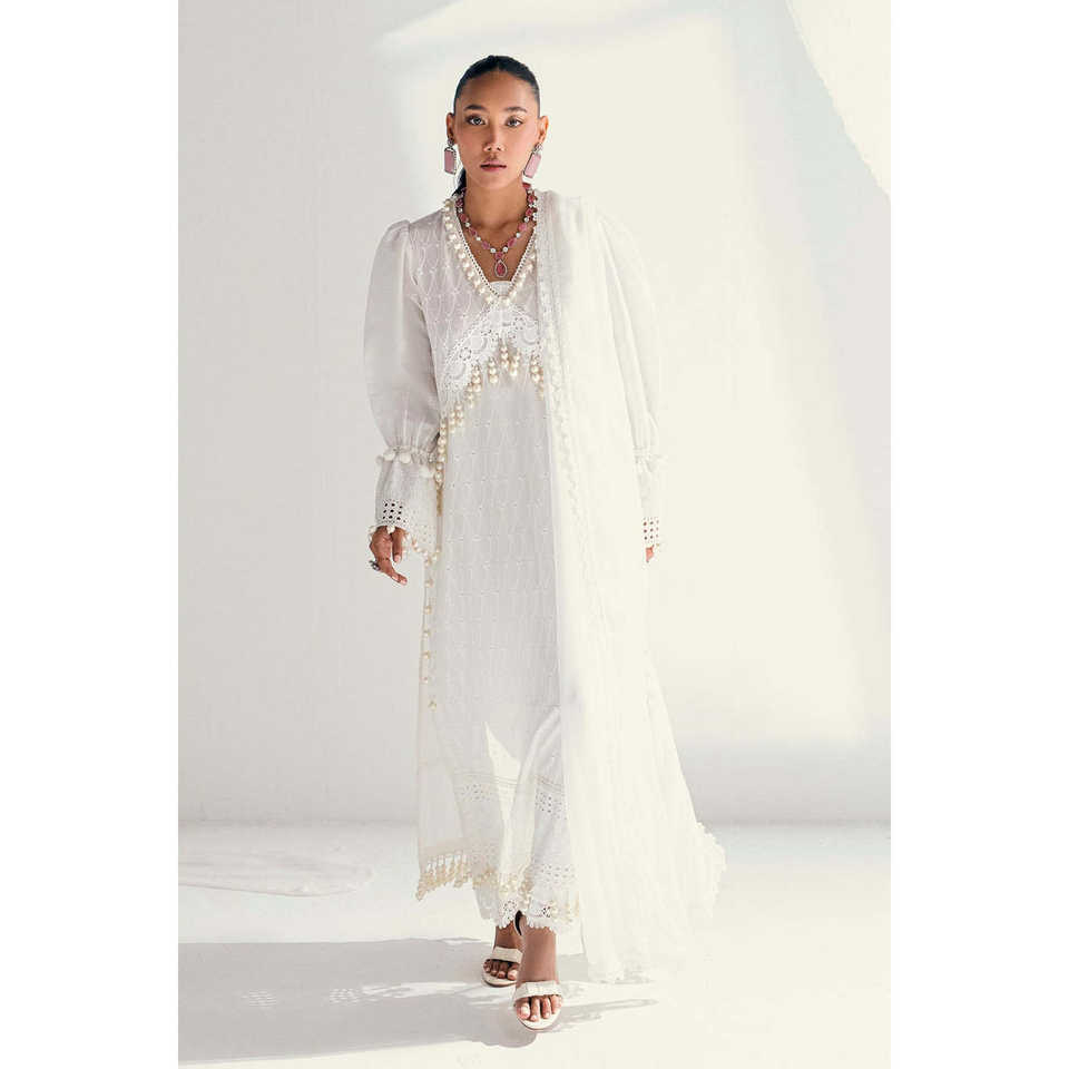 Women's White 3-Piece Unstitched Schiffli Lace Lawn Suit