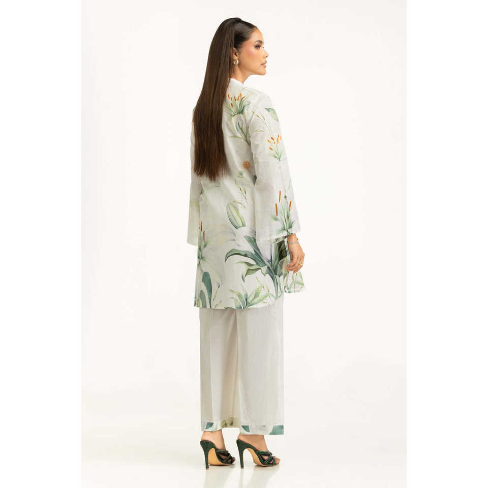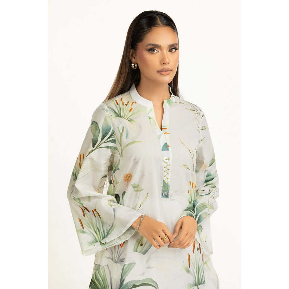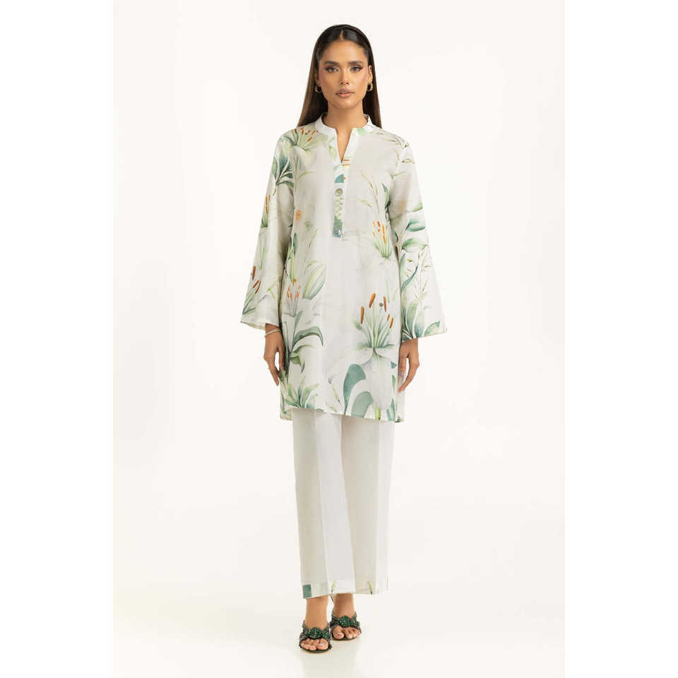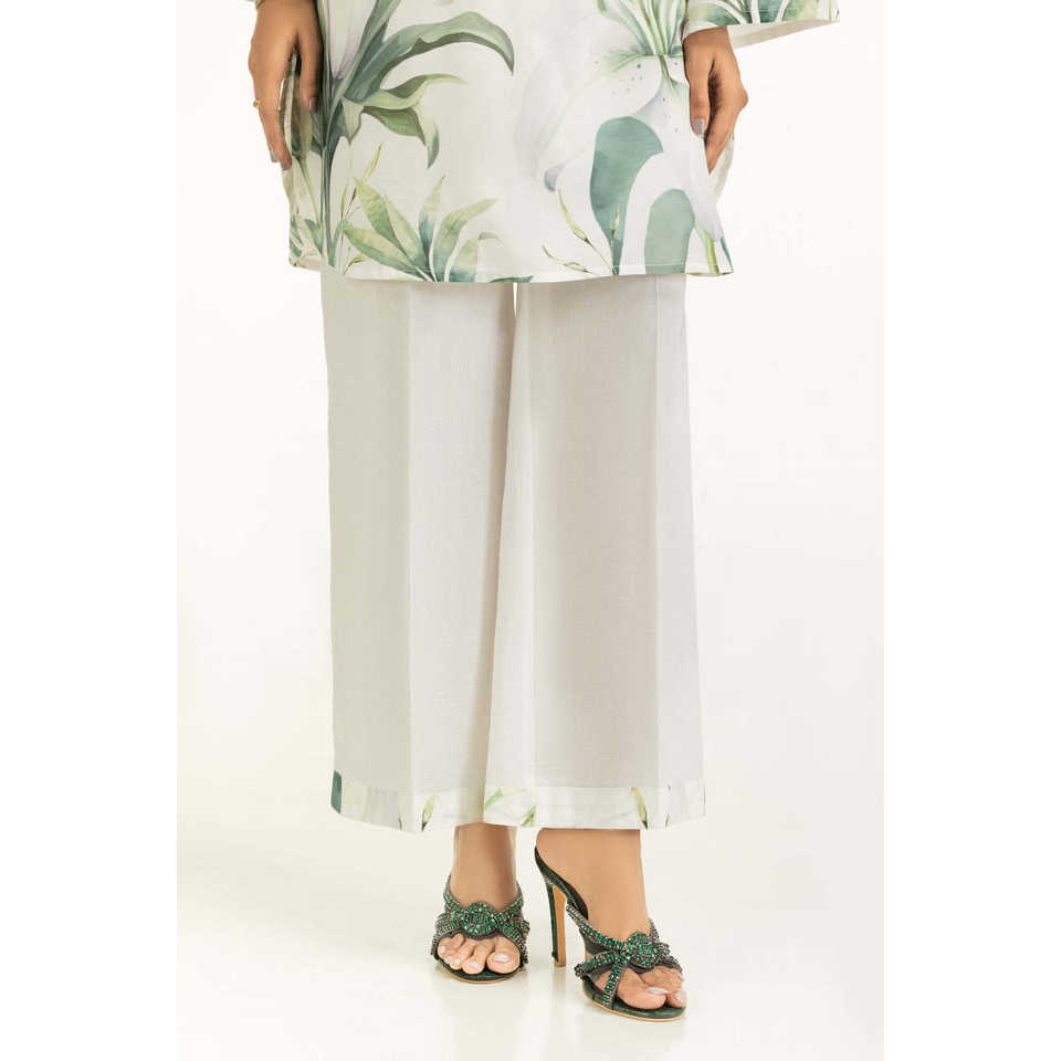 ชุดเซ็ตผ้าแคมบริคพิมพ์ลายสีขาวสำหรับผู้หญิง เสื้อครอปเอวสูงเหนือเข่า ชุดฤดูร้อนสองชิ้น ไซส์ XS