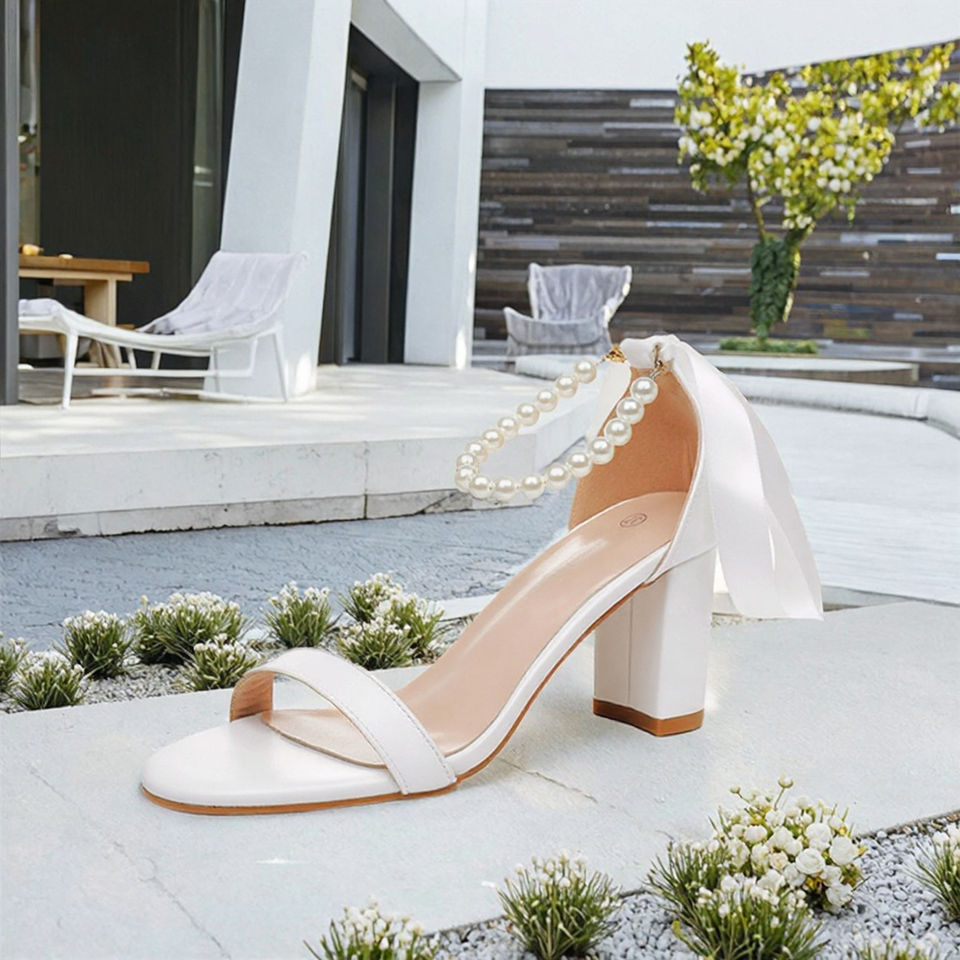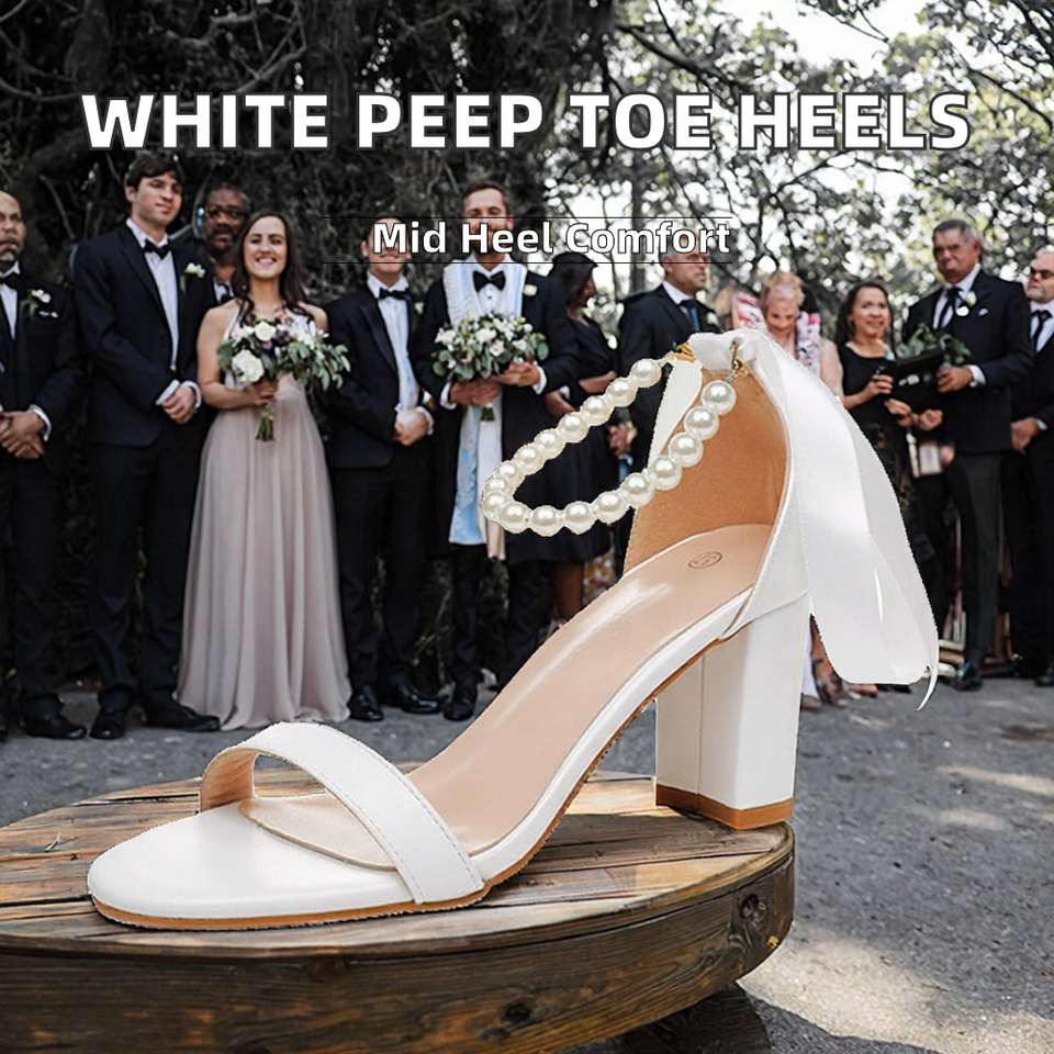 รองเท้าส้นสูงสีขาวสำหรับผู้หญิง, รองเท้าเจ้าสาวเปิดนิ้วเท้า4ซม. 7ซม. 9ซม. รองเท้าส้นสูงสายรัดข้อเท้าแบบเรียบสำหรับฤดูร้อน