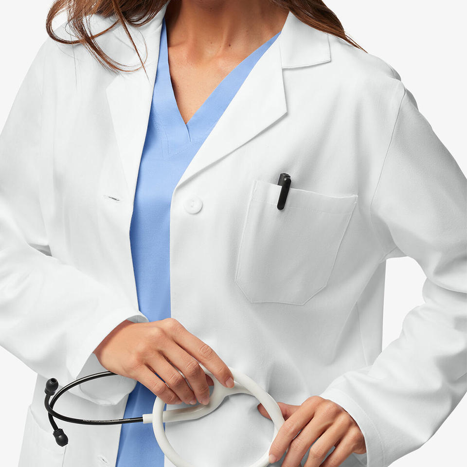 เสื้อโค้ทสำหรับห้องแล็บหมอพยาบาลสีขาวทันสมัยสำหรับผู้หญิงเสื้อโค้ทยูนิฟอร์มทางการแพทย์