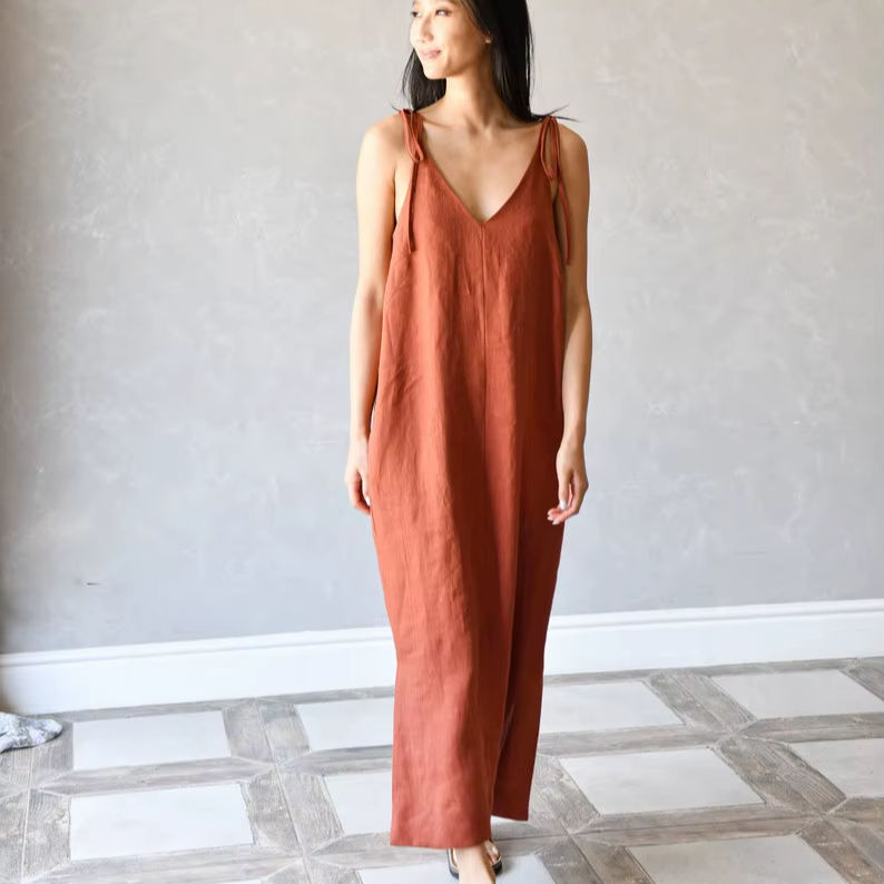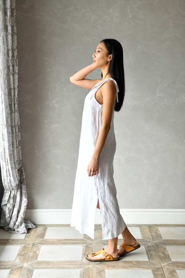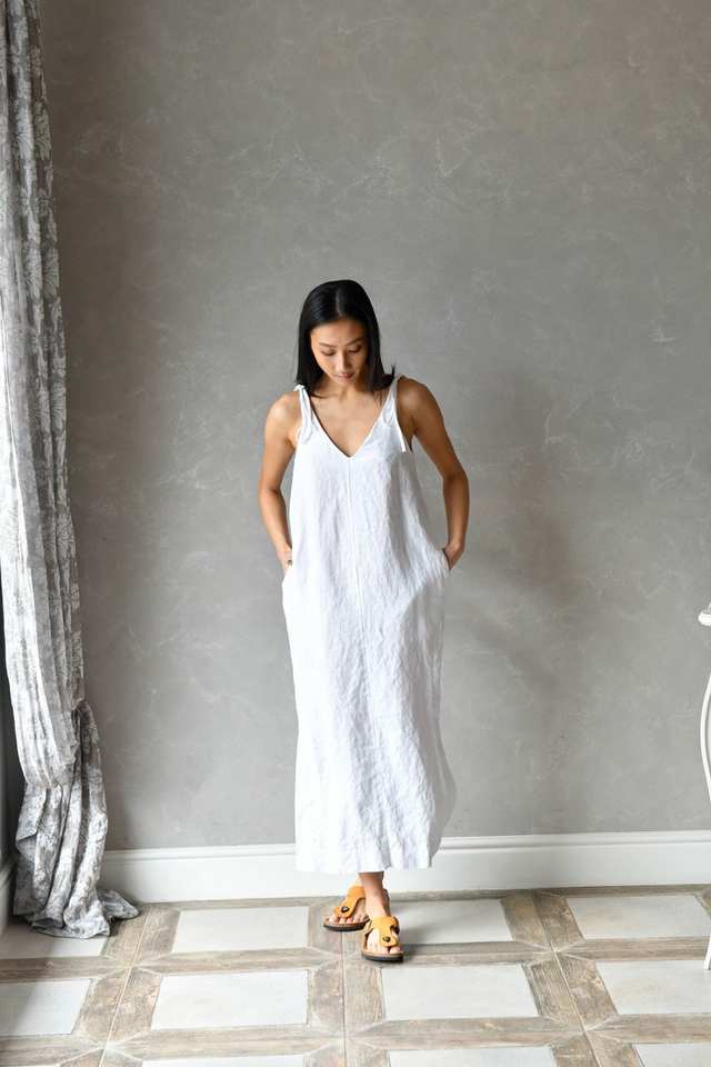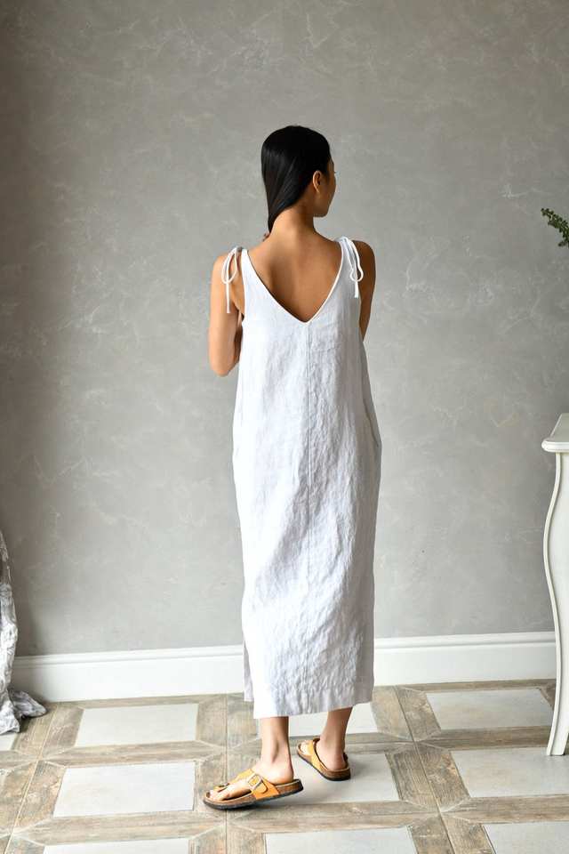 เดรสยาวผ้าลินินสีขาวสำหรับผู้หญิง คอวี ไหล่ตก ทรงปกติ ทรงเอ ระบายอากาศได้ดี เป็นมิตรกับสิ่งแวดล้อม สไตล์ลำลอง สำหรับฤดูร้อน