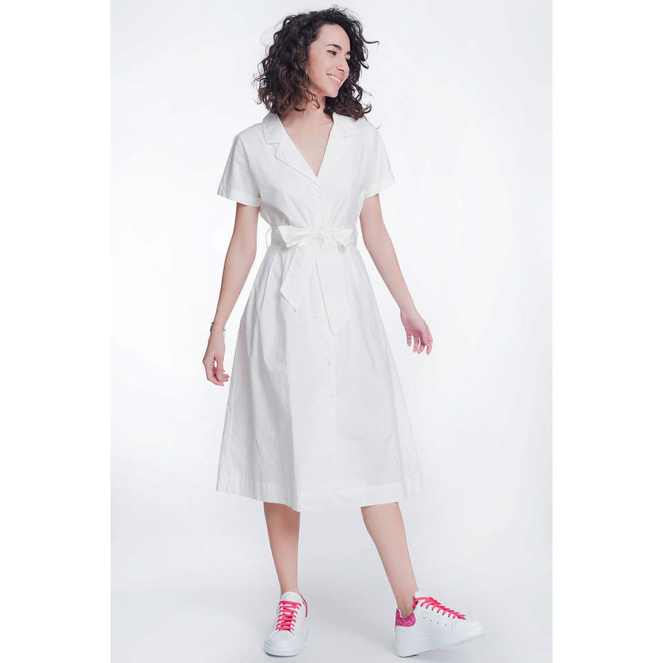 เดรสเชิ้ตผ้าป๊อปลินสีขาวแขนสั้นสำหรับผู้หญิง พร้อมเข็มขัด เสื้อเชิ้ตและเสื้อเบลาส์สุดหรู