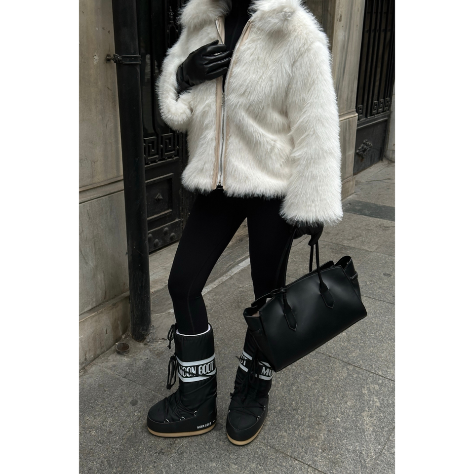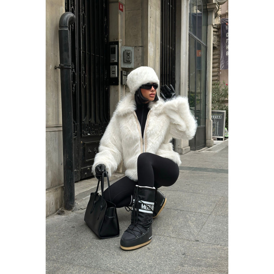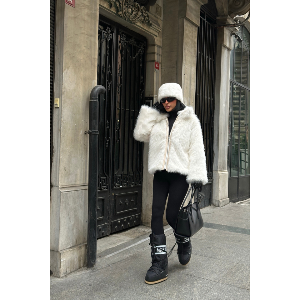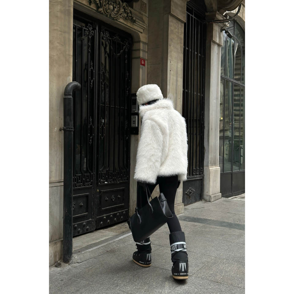 เสื้อโค้ทขนสัตว์เทียมสีขาวแบบสั้นสำหรับผู้หญิง