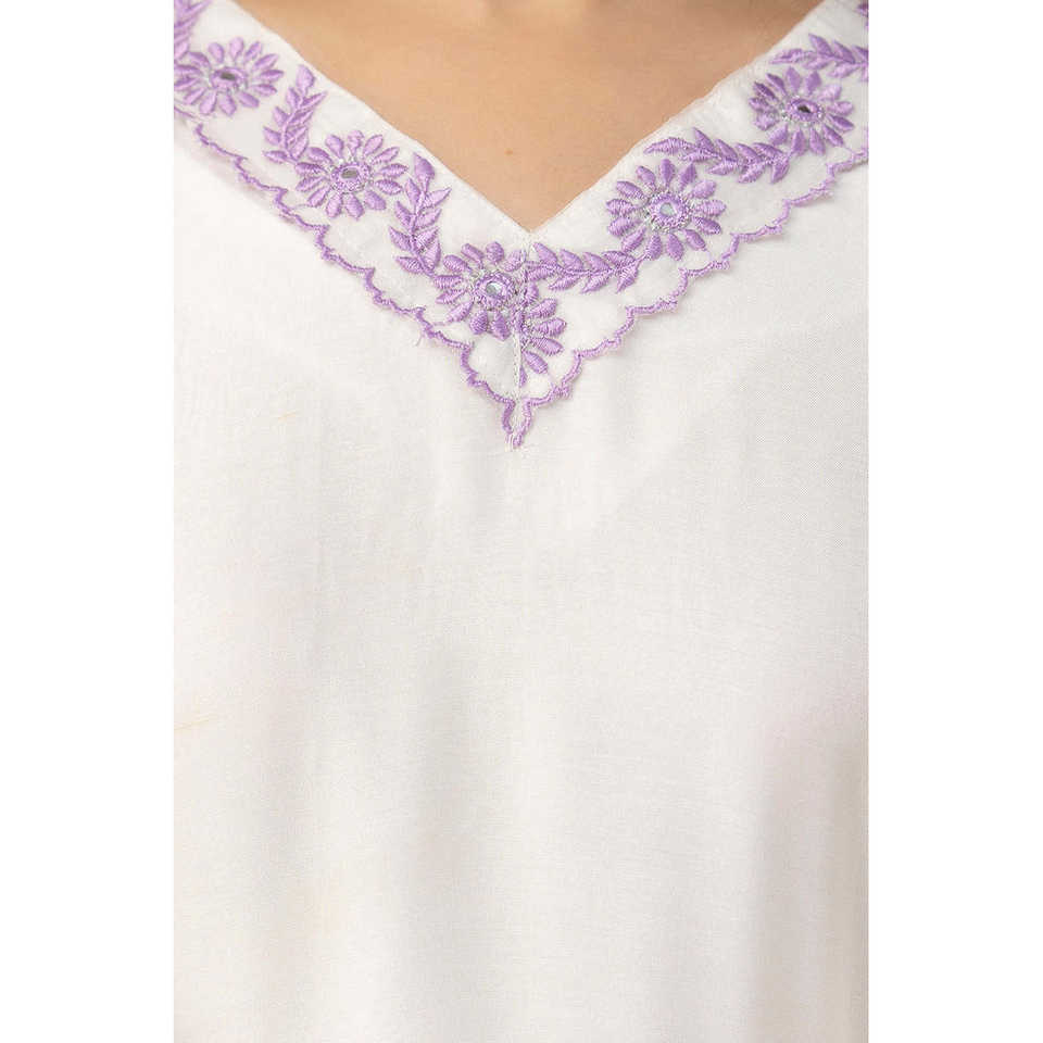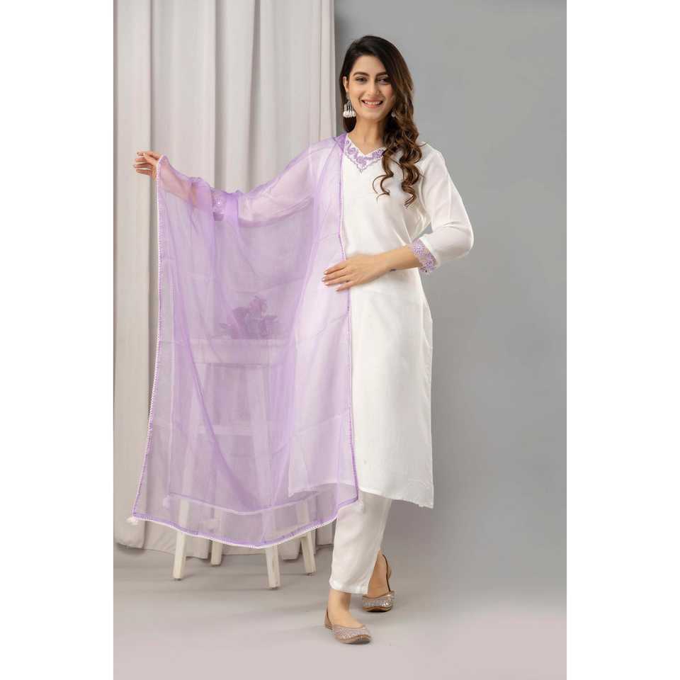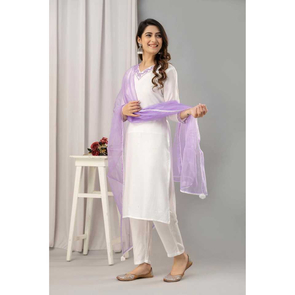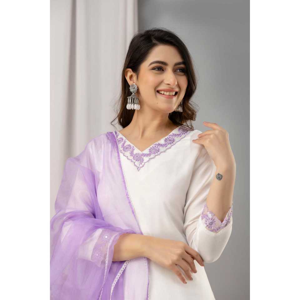 ชุดปักผ้ามัสลินสีขาวและสีม่วงสำหรับผู้หญิงพร้อมกางเกง & dupatta