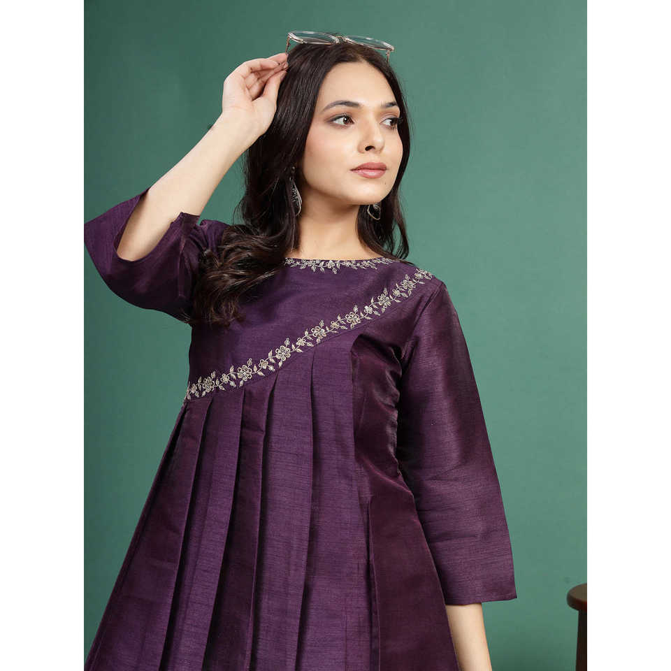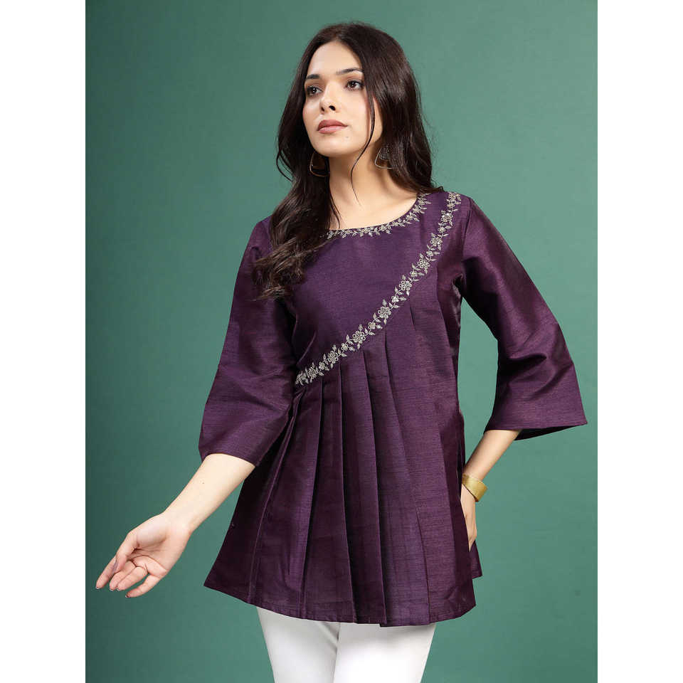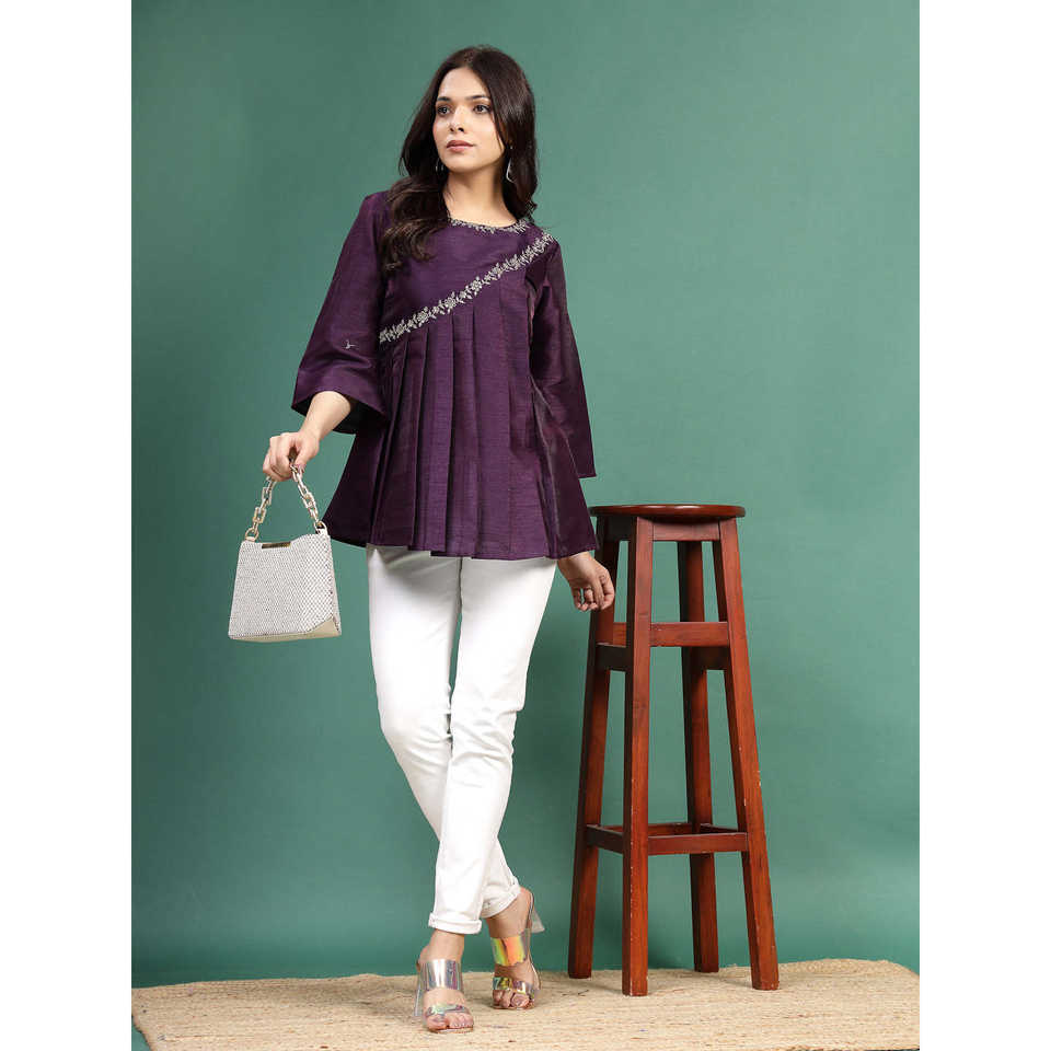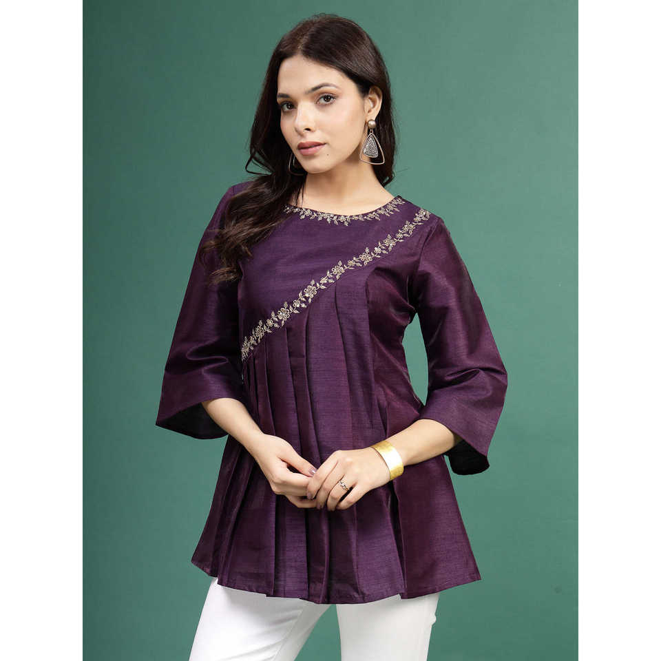 เสื้อถักจีบปักลายดอกไม้สีไวน์สำหรับผู้หญิง