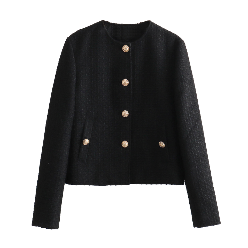 เสื้อแจ็กเก็ตแฟชั่นแบบลำลองสำหรับผู้หญิงเสื้อคอกลมแขนยาวกระดุมแถวเดียวสีดำผ้าทอระบายอากาศได้ดีย้อม