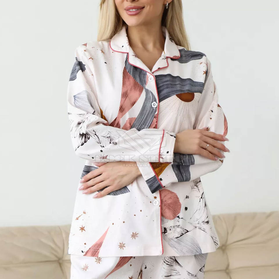 ชุดนอนผ้าไหมถักสำหรับผู้หญิง ลายโลโก้ด้านหน้า ชุดนอนขายาว เนื้อผ้านุ่มสบาย เหมาะสำหรับใส่ที่บ้าน