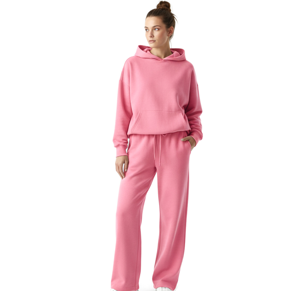 ชุดวอร์มลำลองแบบมีฮู้ดสำหรับผู้หญิง ฤดูหนาว ผ้าโพลีเอสเตอร์ 100% คุณภาพสูง 2 ชิ้น เสื้อและกางเกงเอวยางยืด รักษ์โลก
